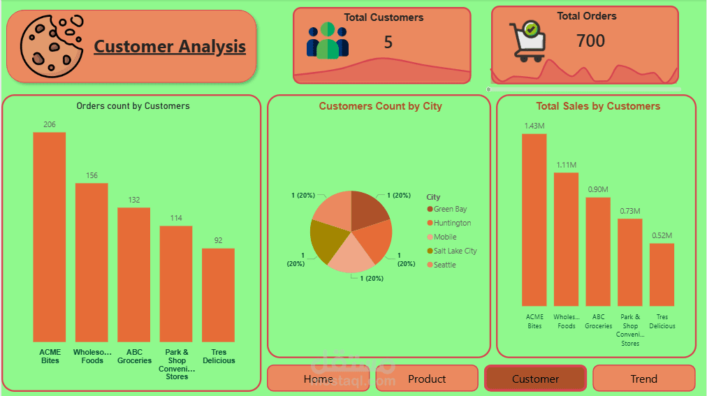 تحديد أفضل العملاء من حيث حجم المبيعات وعدد الطلبات (مثل عميل ACME Bites الذي يتصدر المبيعات بـ 1.43 مليون).