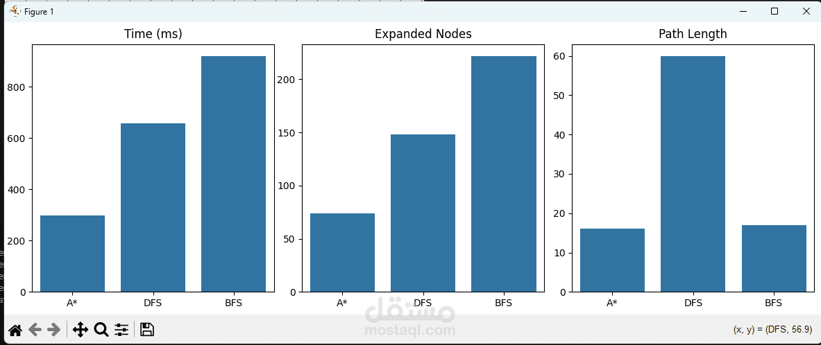 مشروع لتطبيق ومقارنة خوارزميات البحث في المتاهات: A*، BFS، وDFS، مع تمثيل كل خطوة بصريًا على المتاهة.