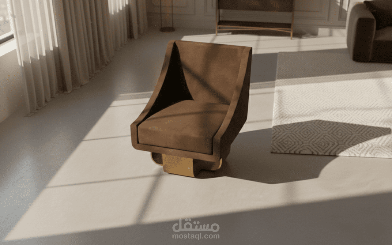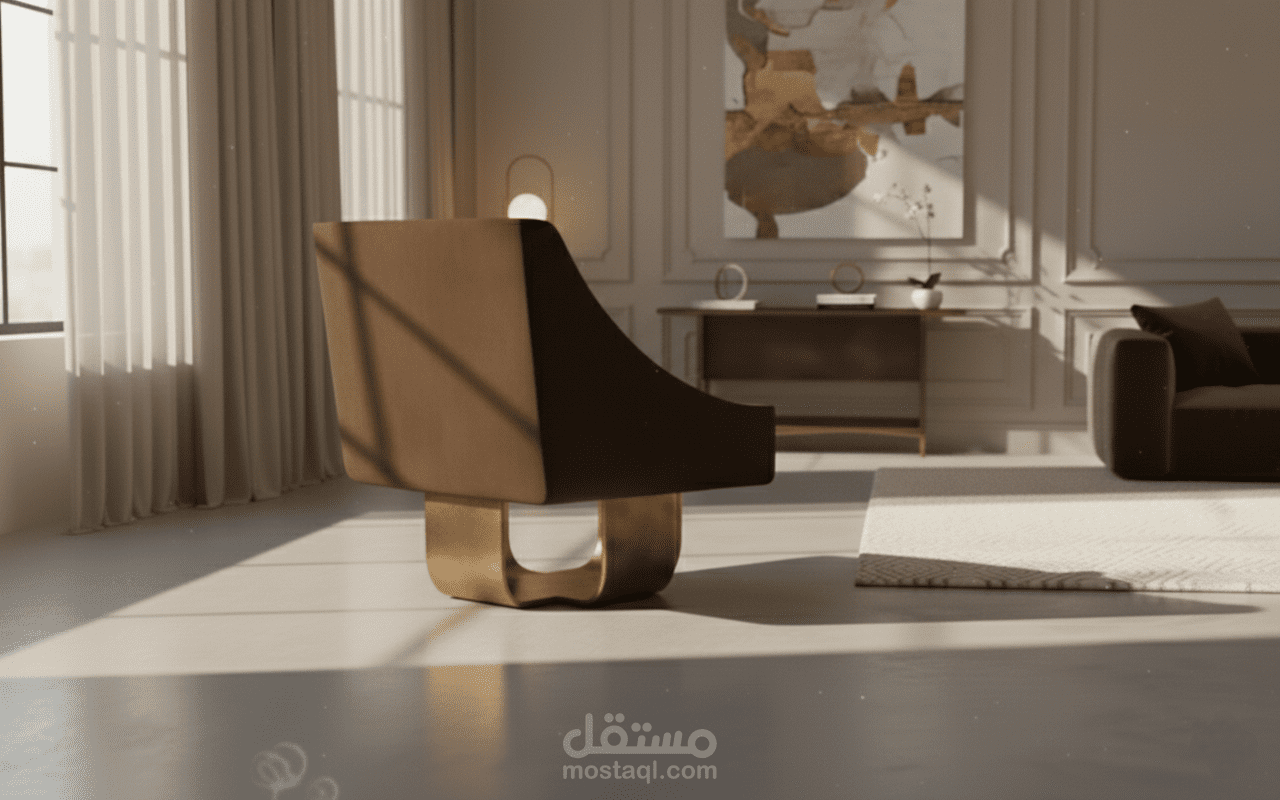 التصميم يعتمد على قاعدة معدنية ذهبية توفر الدعم، مع هيكل مكسو بالمخمل البني الفاخر ليعكس طابع الفخامة المعاصرة. هذا العمل ليس مجرد قطعة أثاث، بل هو محاولة لإعادة إحياء الخط العربي في عناصر حياتنا اليومية بأسلوب (Minimalist) يتناسب مع أرقى الفراغات الداخلية.