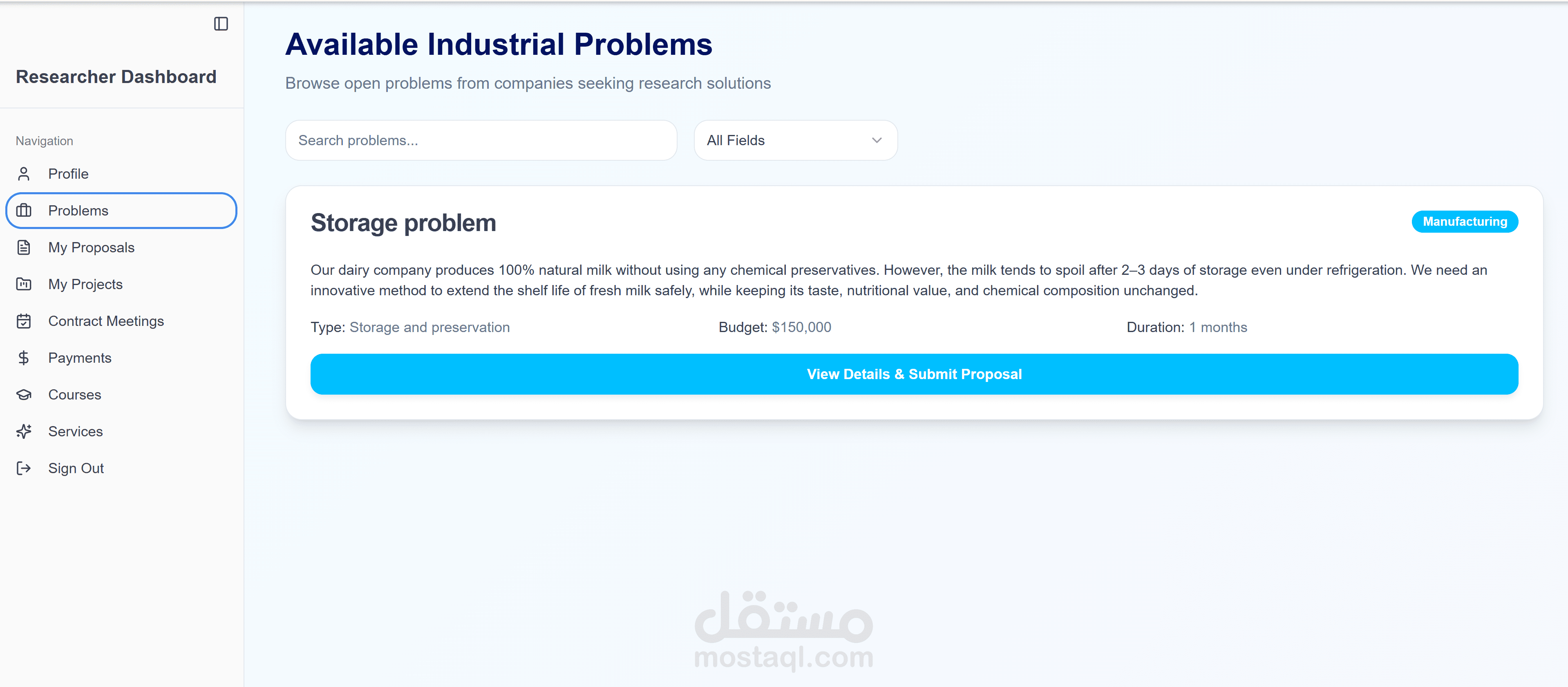 إدارة المشاريع البحثية: توفير لوحة تحكم (Dashboard) لمتابعة سير العمل بين الشركة والباحث منذ طرح المشكلة وحتى الوصول للحل.
