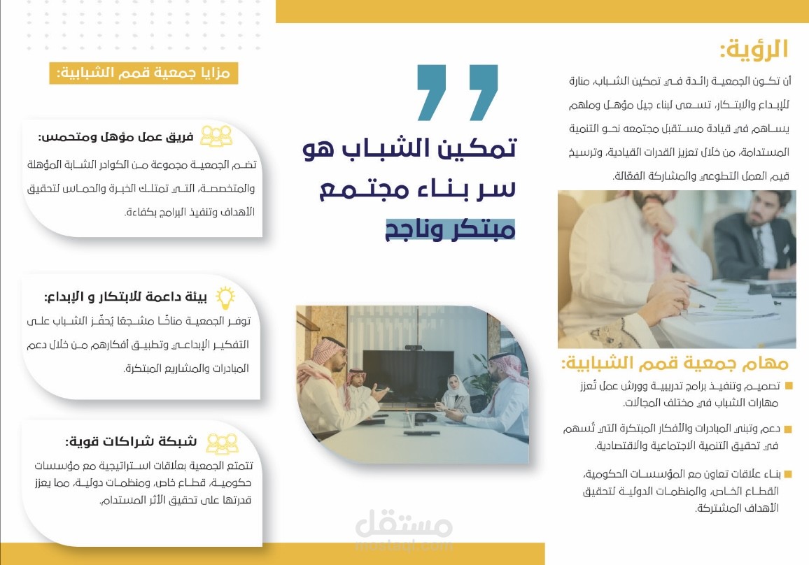 This brochure design is created for an association. It highlights the association’s message and values using a clean and professional layout. The brochure includes the logo, contact information, and sections for programs and activities, making it suitable for awareness campaigns.