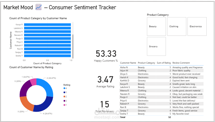 MarketMood is a smart Power BI dashboard that visualizes customer feedback and product sentiment based on reviews, ratings, and categories.