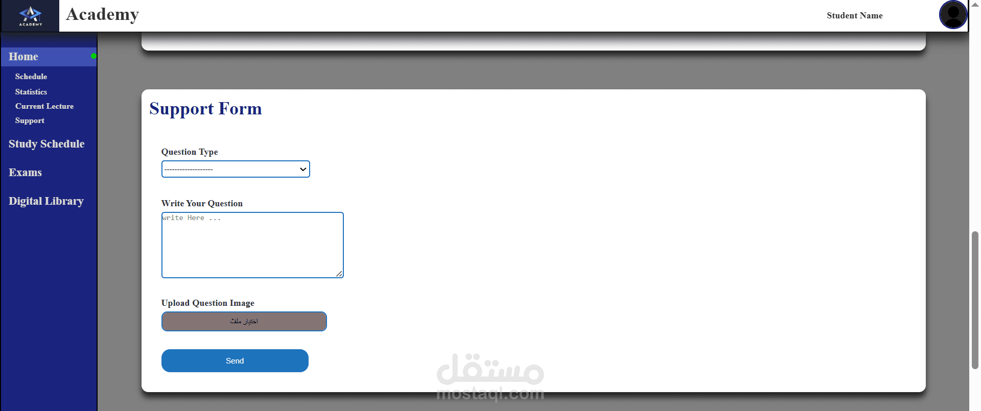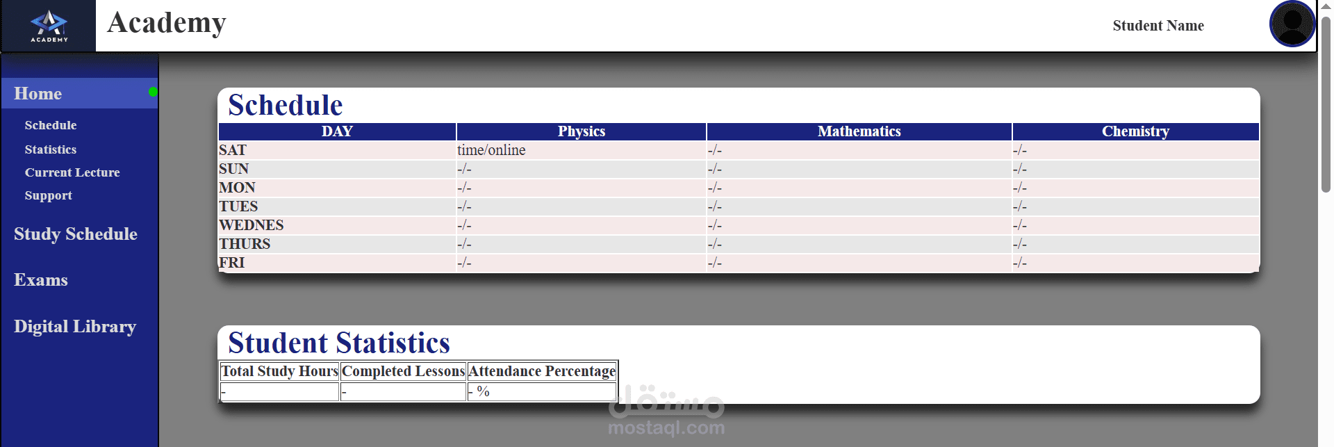 قمت بتطوير صفحة student dashboard لأكاديمية تعليمية. تتيح هذه لصفحة للطالب التنقل بين اقسام مختلفة داخل الصفحة الرئيسية او لباقى صفحات المنصة التعليمية عن طريق شريط تنقل جانبى Side Bar. لوحة الطالب student dashboard تحتوى على قسم مخصص لعرض اخر محاضرة تعليمية تم رفعها على المنصة التعليمية، وقسم اخر يعرض بعض احصائيات الطالب كنسبة الحضور وعدد الدروس المكتملة، وهناك قسم اخر يعرض للطالب جدوله الاسبوعى تفصيليا ليعلمه بمعاد ويوم كل محاضره لكل مادة وهل هى اوفلاين ام اونلاين، واضفت ايضا قسما فى لوحة الطالب مخصص للشكاوى، يستطيع الطالب تحديد نوع الشكوى اذا كانت اداريه او اكاديمية وحقل اخر لكتابة شكوته تفصيليا ورفع اى صور او ملفات مع شكوته وارسالها للدعم الفنى. وصممت ايضا قسما فى الصفحة يحتوى على معلومات التواصل مع الاكاديمية و صفحات الاكاديمية على مواقع التواصل الاجتماعى الاخرى وعنوان مقر الاكاديمية مع حفظ حقوق الطبع والنشر للأكاديمية.