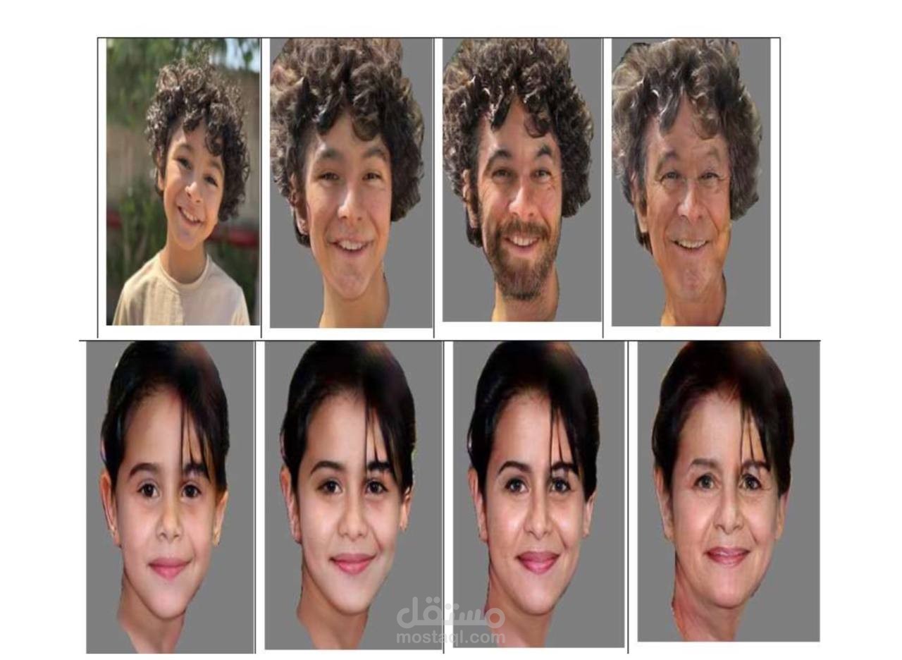 الوصف: تطوير موديل GAN لتوليد صور توقعية لملامح الوجه بعد عدة سنوات، مع تحسين جودة الصور باستخدام StyleGAN2 وAttention Mechanisms.