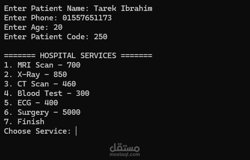 يتيح النظام تسجيل بيانات المريض، اختيار الخدمات الطبية المطلوبة، وحساب إجمالي الفاتورة بشكل تلقائي، مع عرض ملخص كامل للبيانات المدخلة.