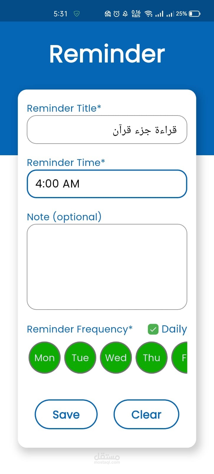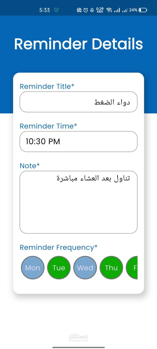 تذكيرات أسبوعية مرنة: إمكانية اختيار أيام محددة خلال الأسبوع (مثلاً: الثلاثاء والخميس والسبت) لتكرار التذكير.