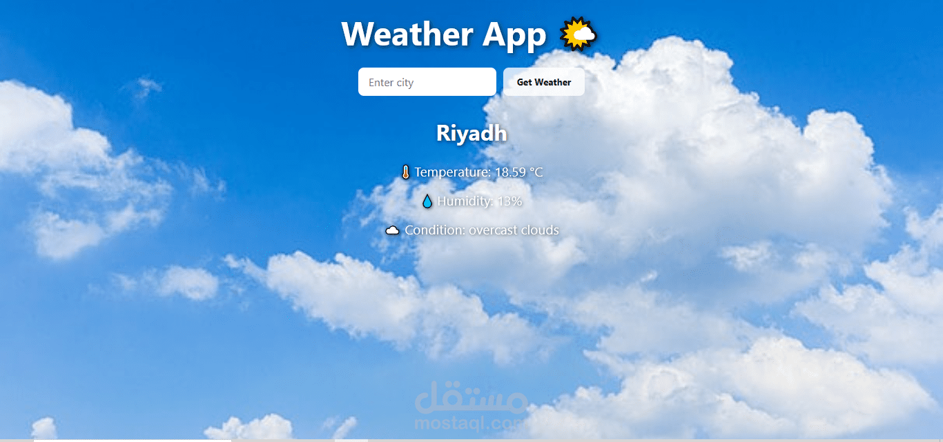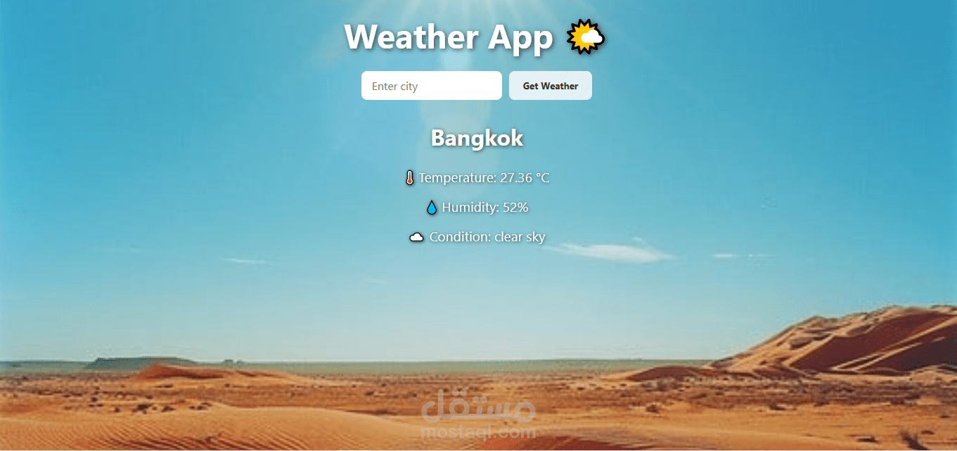 يقوم المستخدم بإدخال اسم المدينة ثم يقوم التطبيق بجلب بيانات الطقس مباشرة باستخدام Weather API وعرض المعلومات الأساسية بطريقة واضحة وبسيطة.