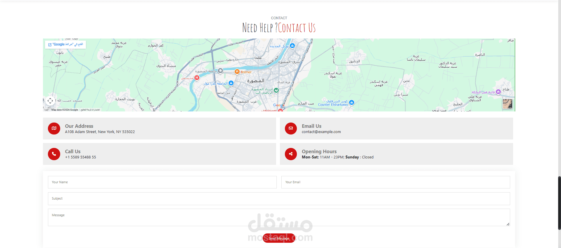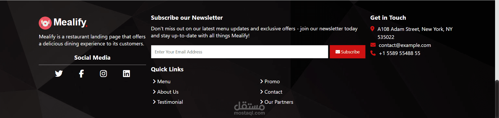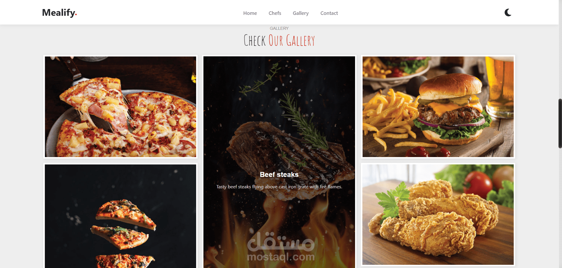 تحتوي الصفحة على أقسام رئيسية مثل قسم التعريف بالمطعم، عرض قائمة الطعام أو المنتجات، وقسم للتواصل أو الحجز. تم تصميم الصفحة لتكون متجاوبة مع جميع الشاشات (Responsive) بحيث تعمل بشكل جيد على الهاتف والكمبيوتر.