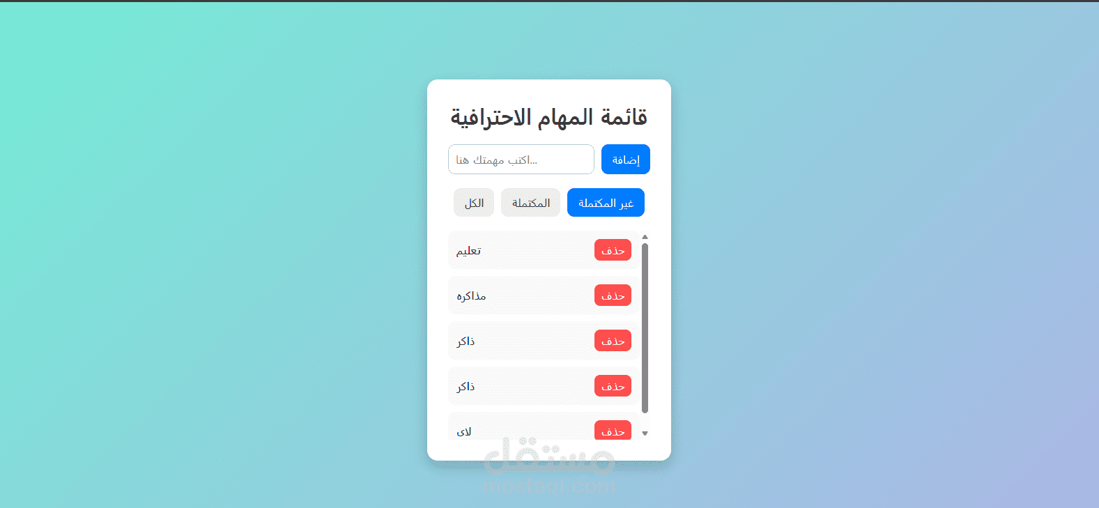 هذا مشروع احترافي لتطبيق قائمة مهام (To-Do List) باستخدام HTML, CSS, و JavaScript، يتميز بما يلي: