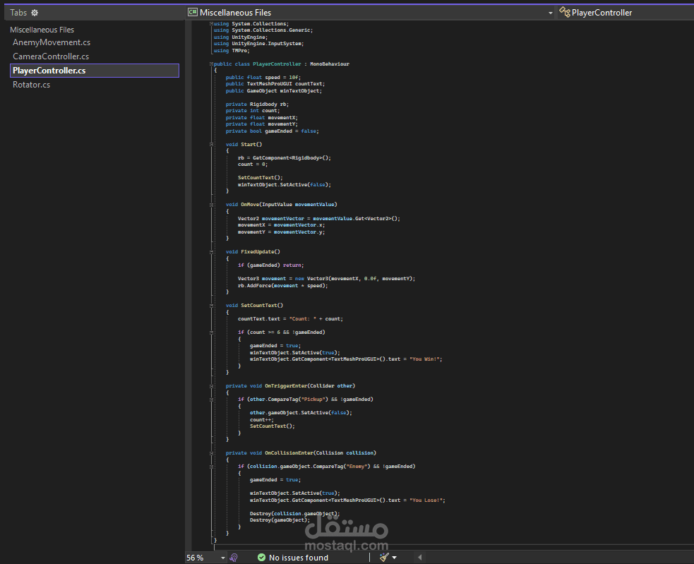 هذا المشروع عبارة عن لعبة ثلاثية الأبعاد بسيطة تم تطويرها باستخدام Unity. تعتمد فكرة اللعبة على التحكم في كرة متحركة داخل بيئة تفاعلية، حيث يقوم اللاعب بجمع العناصر المنتشرة في الخريطة مع تجنب العقبات المختلفة.
