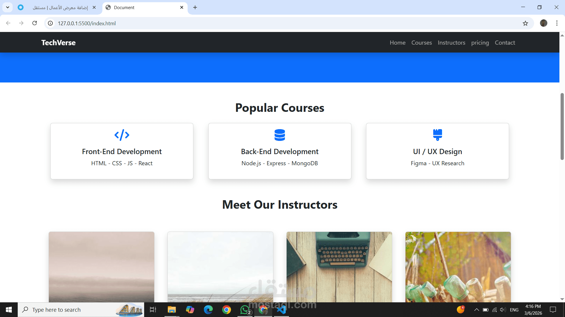 The website includes pages such as Courses, Instructors, Pricing, and Contact with a responsive and organized layout.