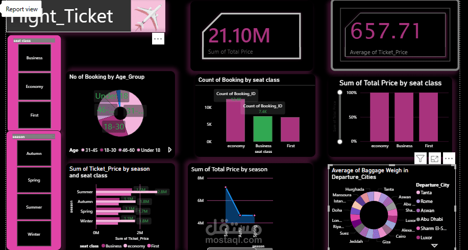 تم إنشاء مجموعة من المقاييس باستخدام لغة DAX لحساب مؤشرات الأداء الرئيسية مثل: