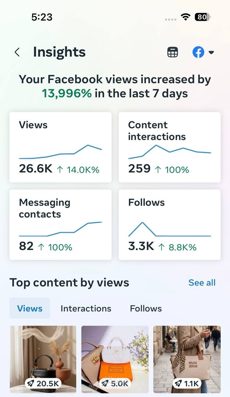 راند شنط نسائية ناشئ، عملنا على تطوير حضوره الرقمي وبناء الوعي بالعلامة التجارية على منصات السوشيال ميديا. تم التركيز على زيادة Reach الصفحة وتحسين وصول المحتوى للجمهور المستهدف، بالإضافة إلى إدارة وتشغيل حملات إعلانية (Sales Campaigns) على فيسبوك وإنستجرام.