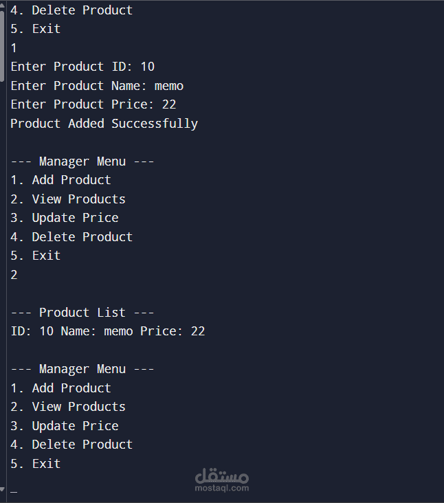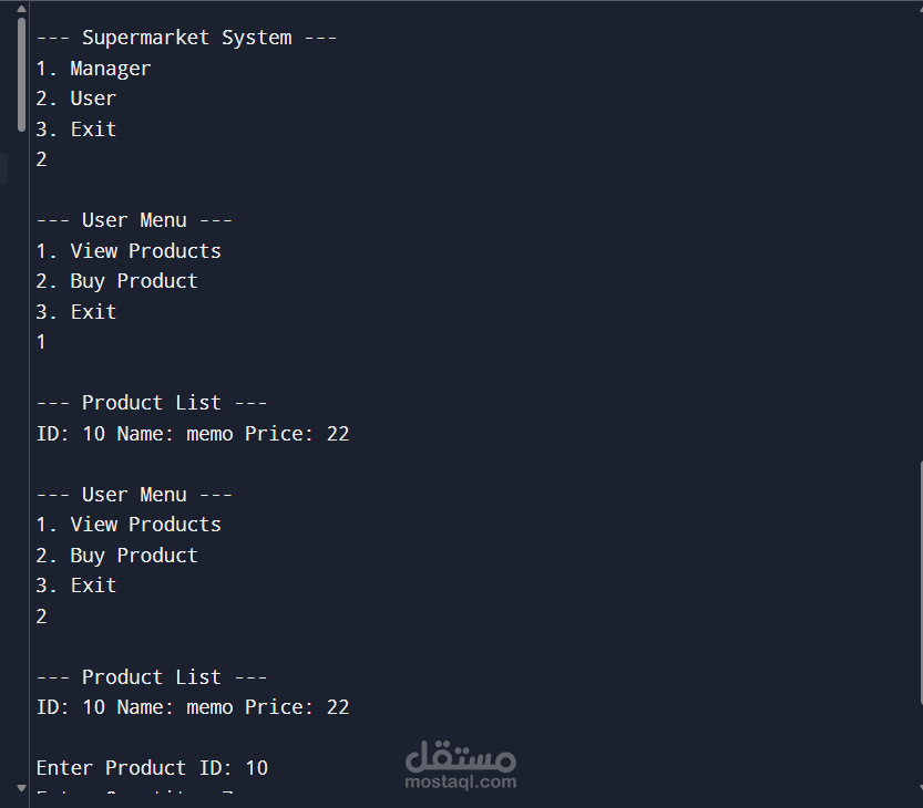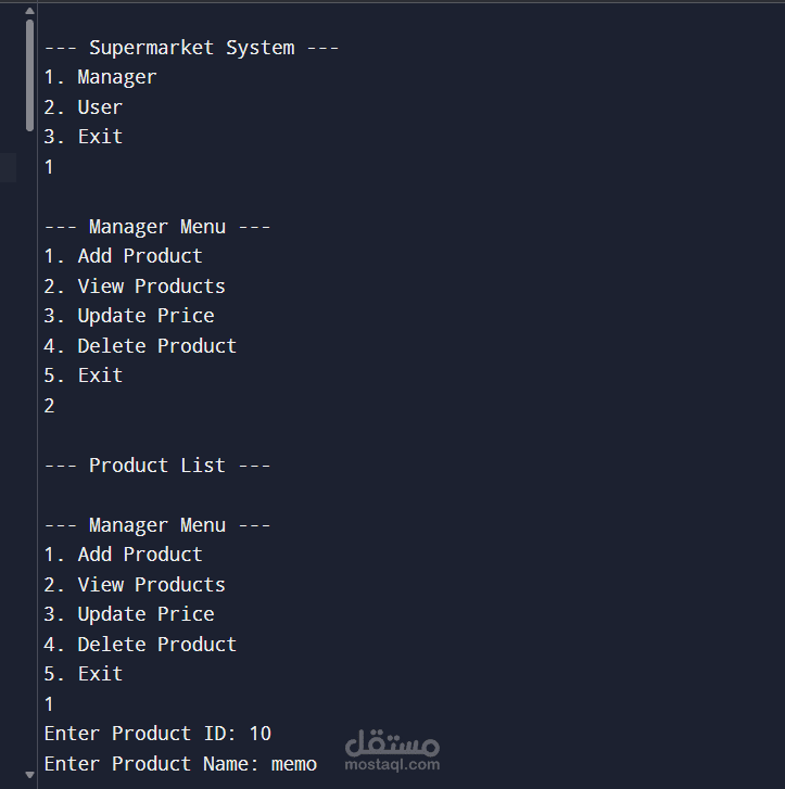 In **Manager Mode**, the administrator can manage the products available in the supermarket. This includes adding new products, viewing the list of products, updating product prices, and deleting products from the system.