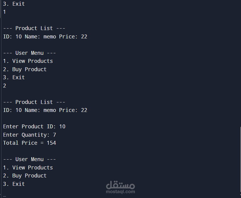 In **User Mode**, customers can view the available products and purchase items by selecting the product ID and quantity. The system then calculates the total cost of the selected items.