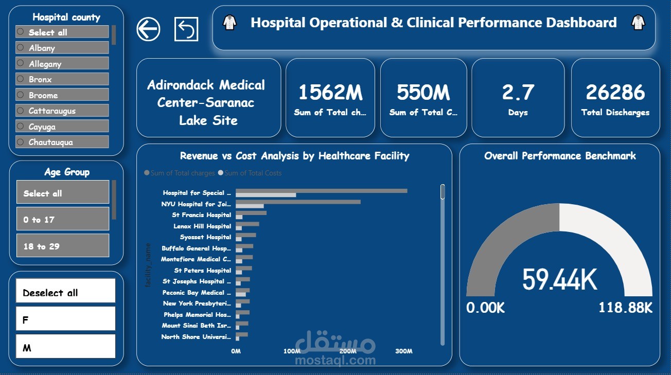 • تحليل كفاءة المنشآت: مقارنة الأداء بين مختلف المستشفيات (Hospital Comparison) لتحديد المراكز الأكثر كفاءة والأعلى في نسب الشفاء أو الخروج (Discharges).