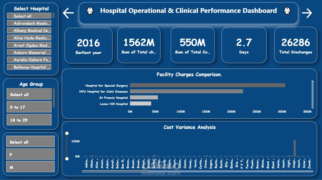 • تفاعلية كاملة: إمكانية تصفية البيانات (Slicers) حسب اسم المستشفى، المنطقة، الفئة العمرية، والجنس للحصول على تقارير مخصصة في ثوانٍ.