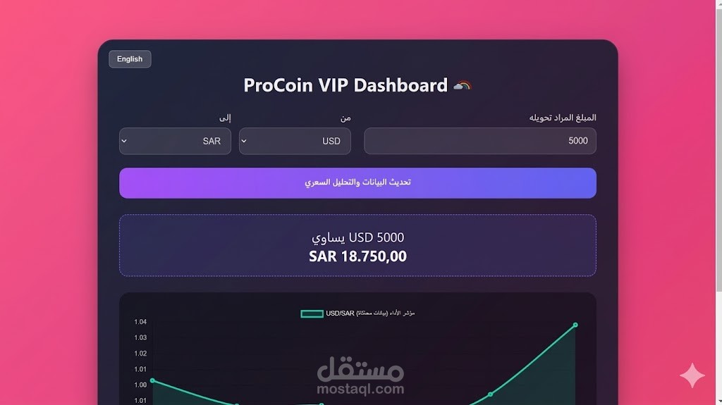 هذا الكود يمثل واجهة برمجية متطورة وشاملة لمنصة تحليل مالي وتحويل عملات أطلقت عليها اسم "ProCoin VIP Dashboard". يعتمد الكود على تقنيات الويب الأساسية (HTML5, CSS3, JavaScript) مع دمج مكتبات خارجية وأدوات ربط بيانات حية.