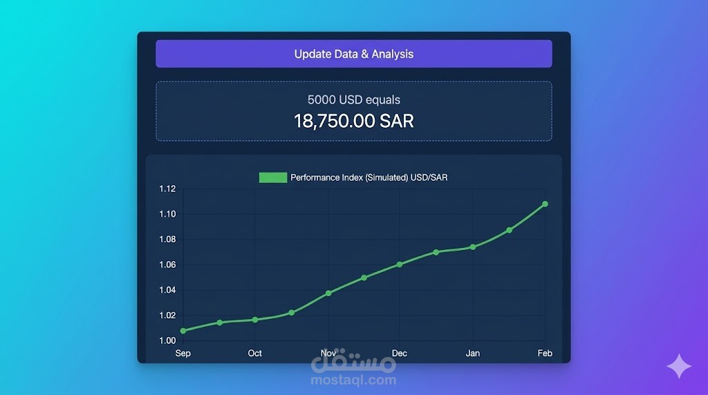 البيانات المحاكية: حالياً، يقوم الكود بتوليد بيانات عشوائية (mockData) لرسم المنحنى البياني، مما يعطي المستخدم تصوراً عن كيفية تحرك العملة عبر الأشهر (من سبتمبر إلى فبراير).