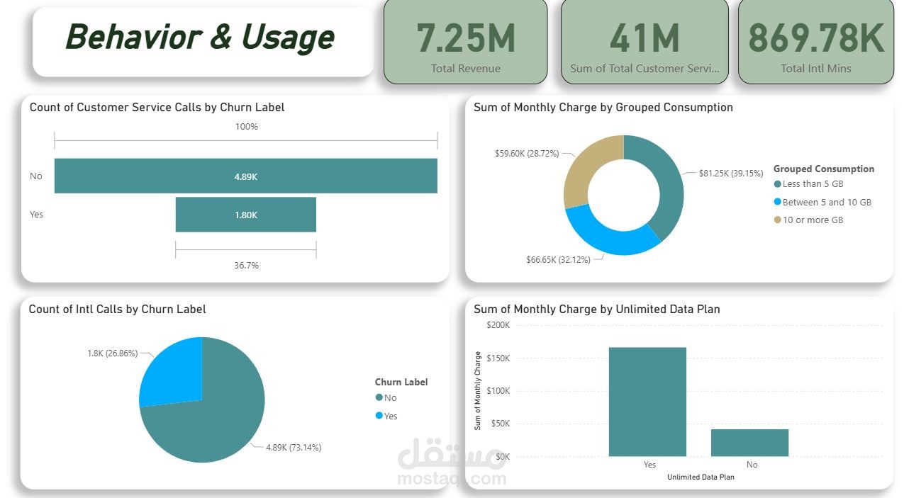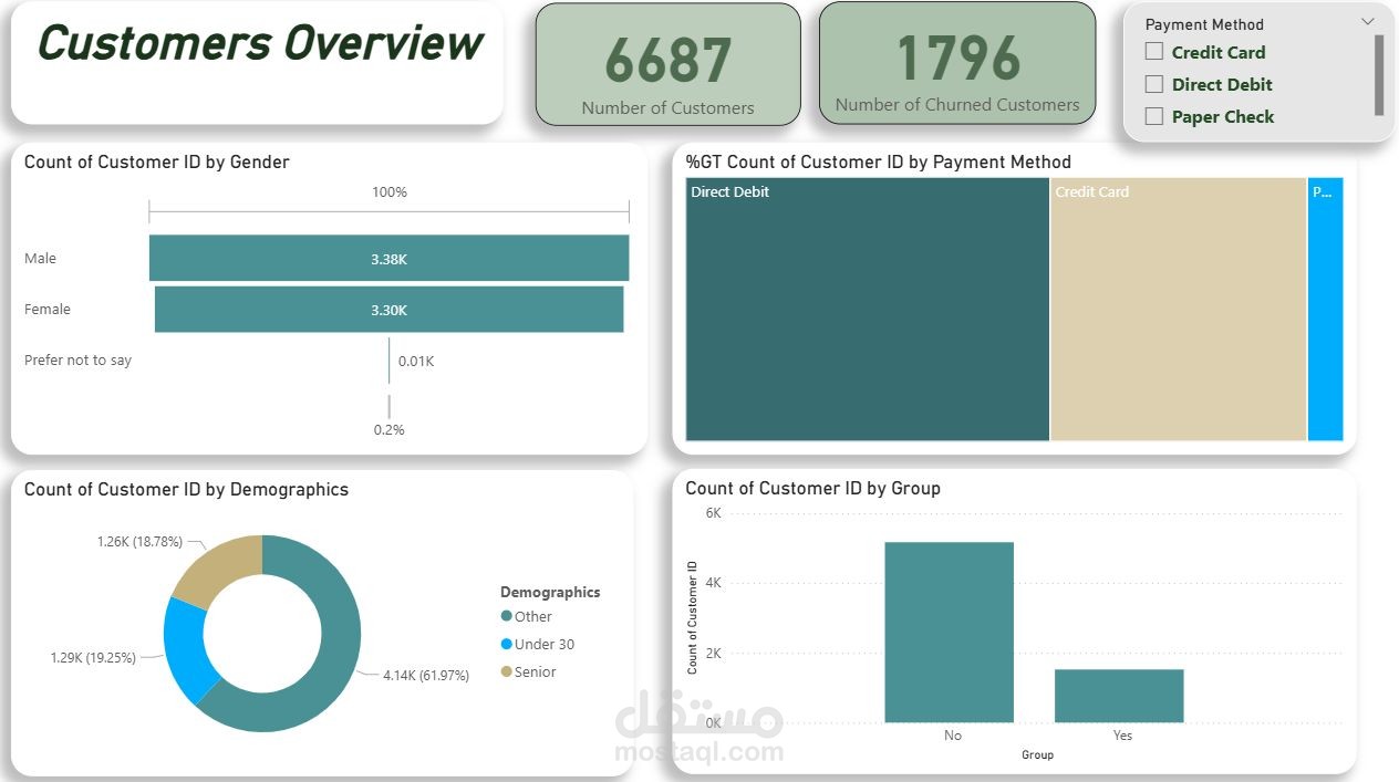 تم تصميم لوحة المعلومات باستخدام Power BI لعرض البيانات بطريقة بصرية واضحة وتفاعلية، بحيث يمكن للمستخدم استكشاف البيانات بسهولة وفهم الأنماط والاتجاهات التي تؤثر على سلوك العملاء.