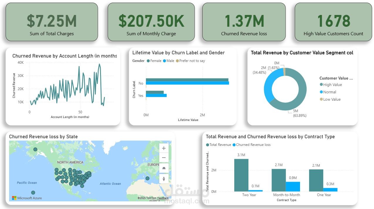 يتضمن المشروع تحليل مجموعة من المؤشرات المهمة مثل معدل فقدان العملاء، وعدد العملاء الكلي، وعدد العملاء الذين غادروا الخدمة. كما يتم تحليل البيانات من عدة زوايا مثل أسباب ترك العملاء للخدمة، وطرق الدفع المختلفة، بالإضافة إلى توزيع العملاء الذين غادروا حسب الولايات.