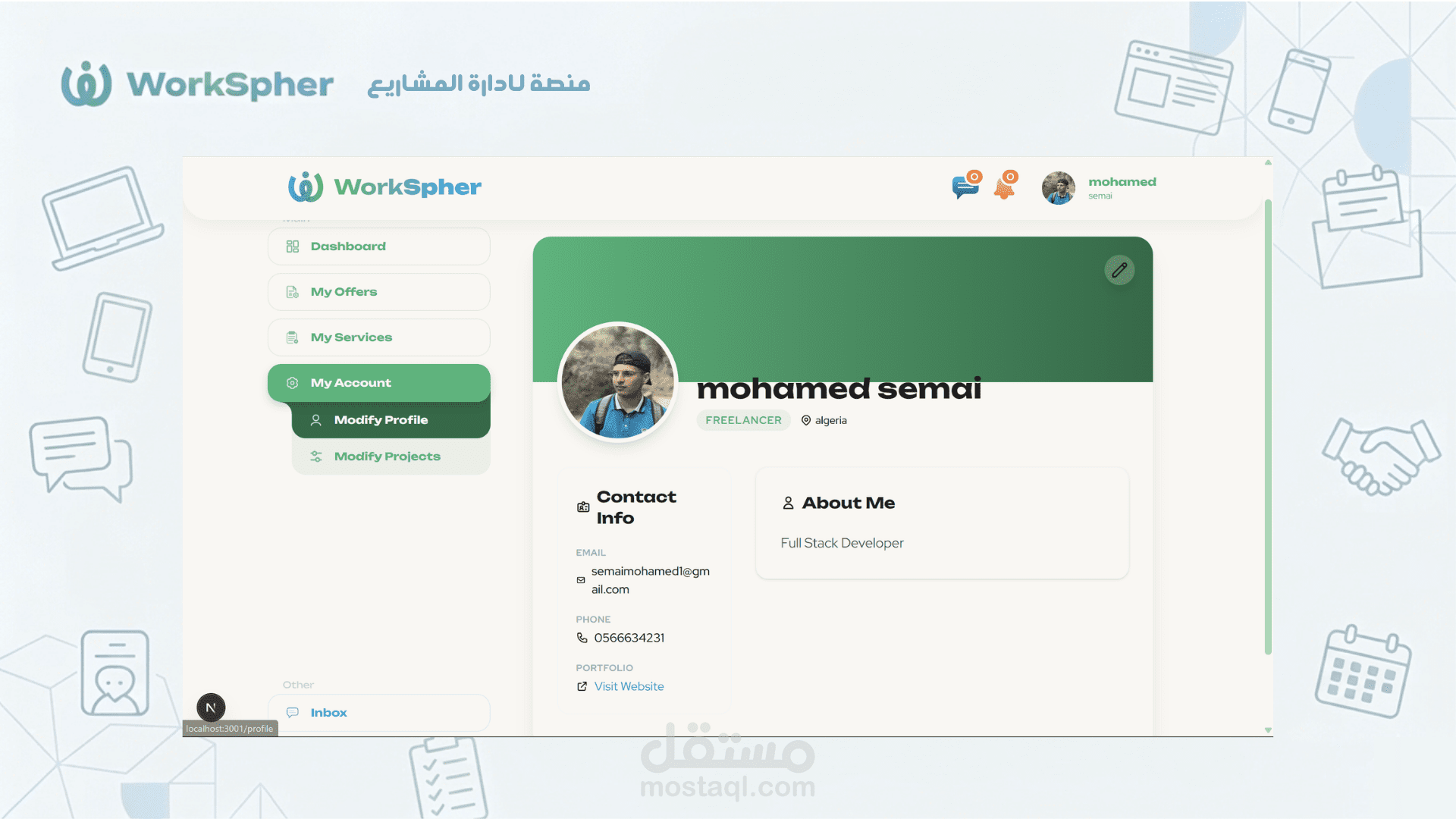 WorkSphere هو عبارة عن منصة عمل حر (Freelance Platform) عصرية مصممة لربط العملاء بالمستقلين المحترفين. توفر المنصة تجربة سلسة لإدارة المشاريع، تقديم العروض، والتواصل اللحظي، مع التركيز على الأداء العالي وتجربة المستخدم السلسة.