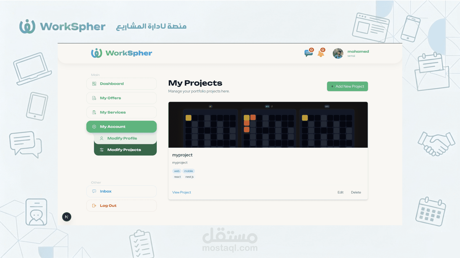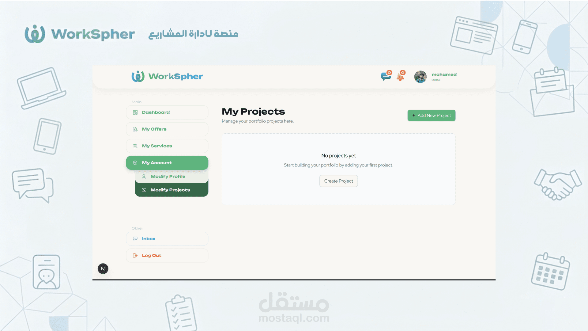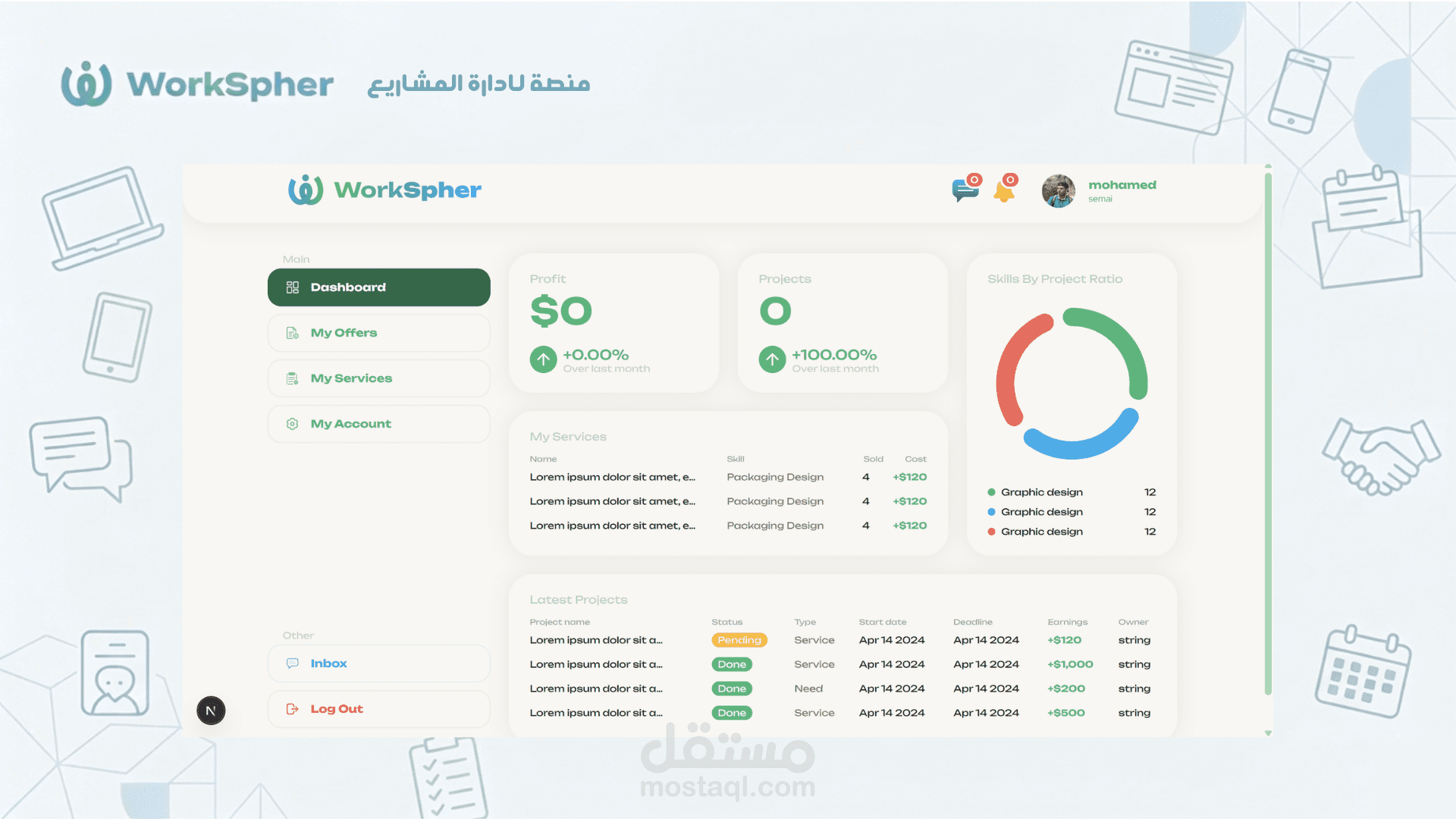 إدارة المشاريع (Project Management): نشر احتياجات المشاريع (My Needs) وعرض الخدمات (My Services) وتتبع حالة العروض.