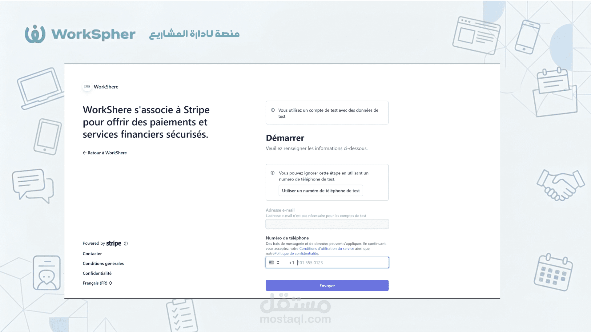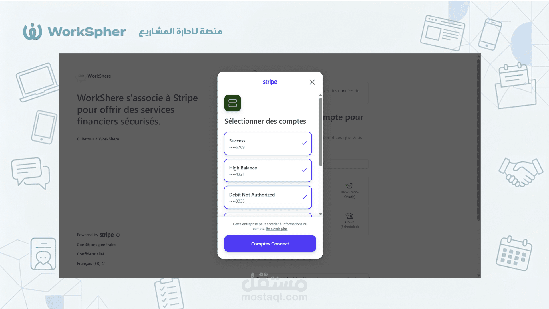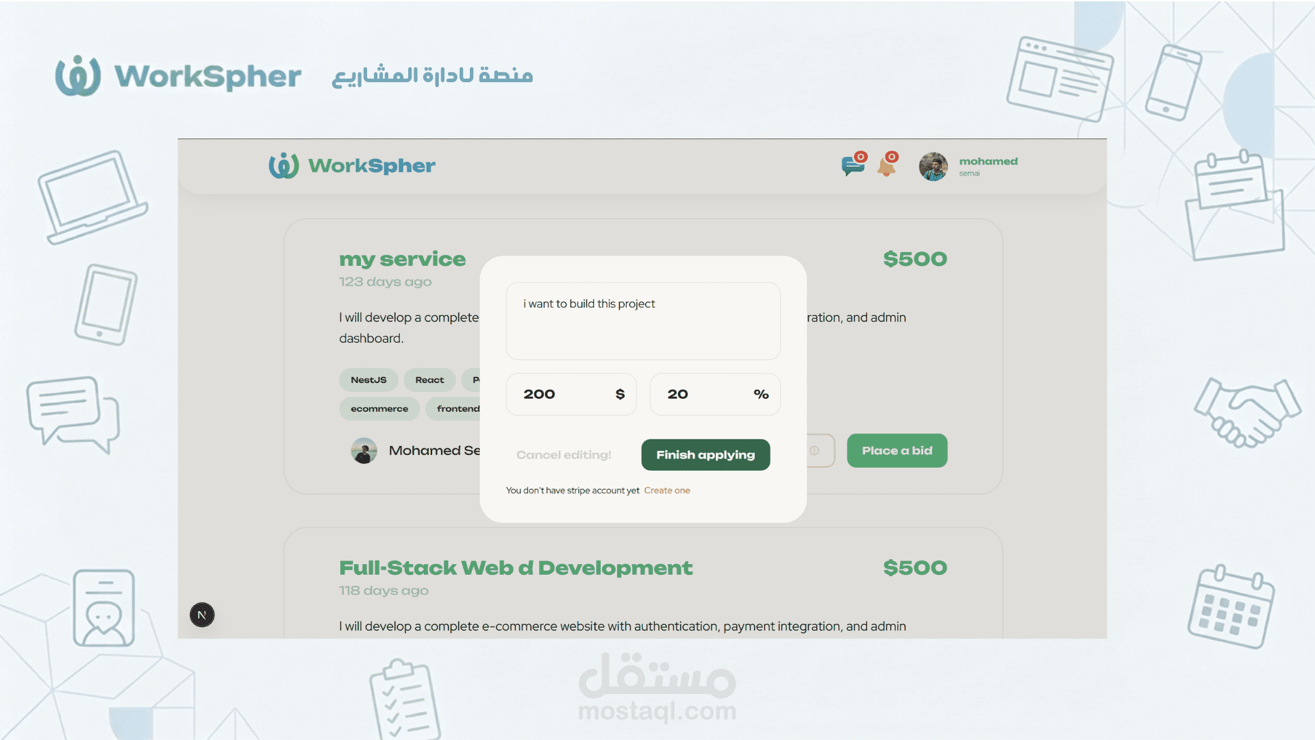 نظام المدفوعات (Stripe): معالجة الدفع الآمن وحجز المبالغ بين العميل والمستقل لضمان حقوق الطرفين.