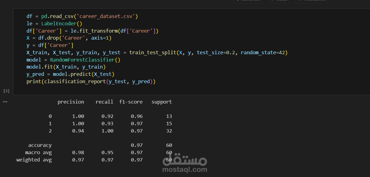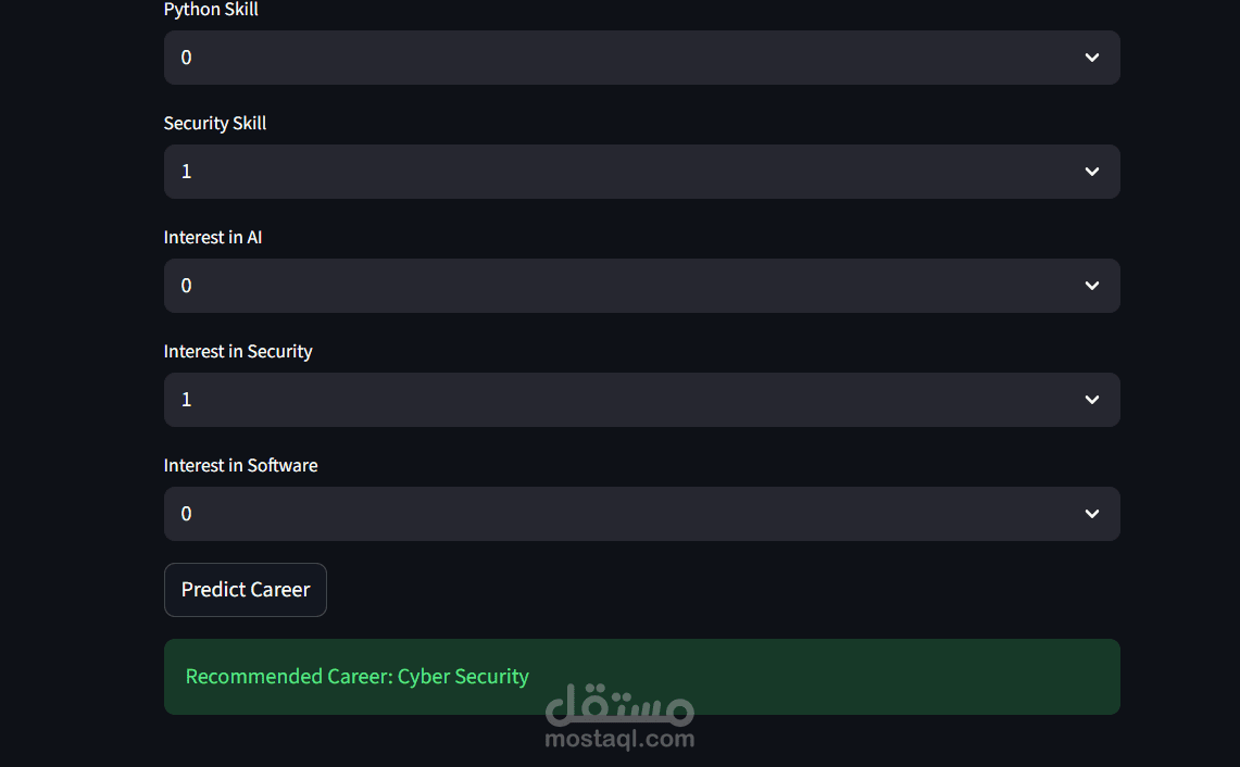 يهدف هذا المشروع إلى تطوير نظام ذكي لتوصية المسار المهني للطلاب باستخدام تقنيات تعلم الآلة (Machine Learning). يساعد هذا النظام الطلاب على اختيار التخصص أو المجال المهني الأنسب لهم بناءً على درجاتهم الأكاديمية، مهاراتهم التقنية، واهتماماتهم الشخصية.