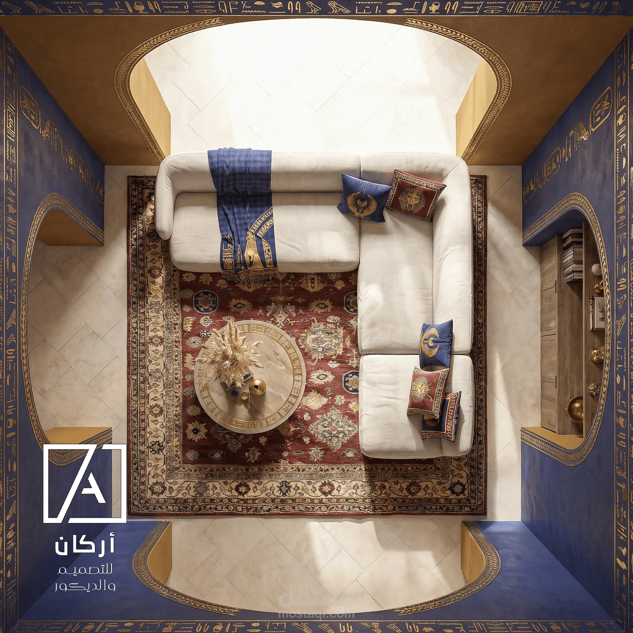 This interior design project is a refined reinterpretation of ancient Egyptian heritage through a contemporary lens. The living room blends historical symbolism with modern comfort, creating a space that feels both timeless and luxurious.
