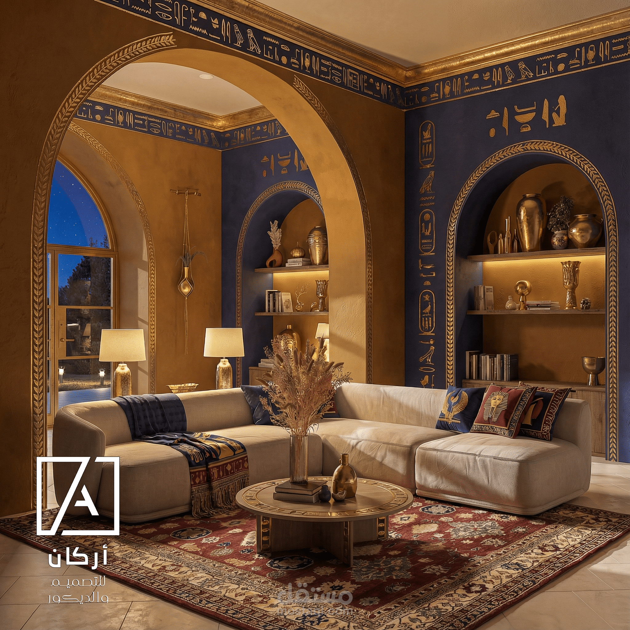 Rich royal blue and warm gold tones dominate the palette, inspired by classical Egyptian temples and royal chambers. Handcrafted hieroglyphic motifs and arched niches frame the space, adding cultural depth and architectural elegance without overwhelming the modern layout.
