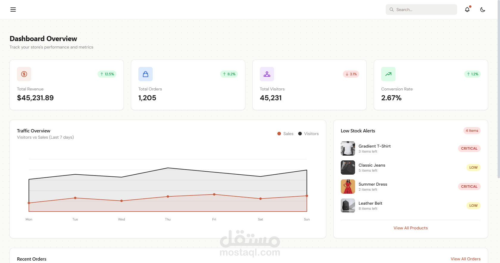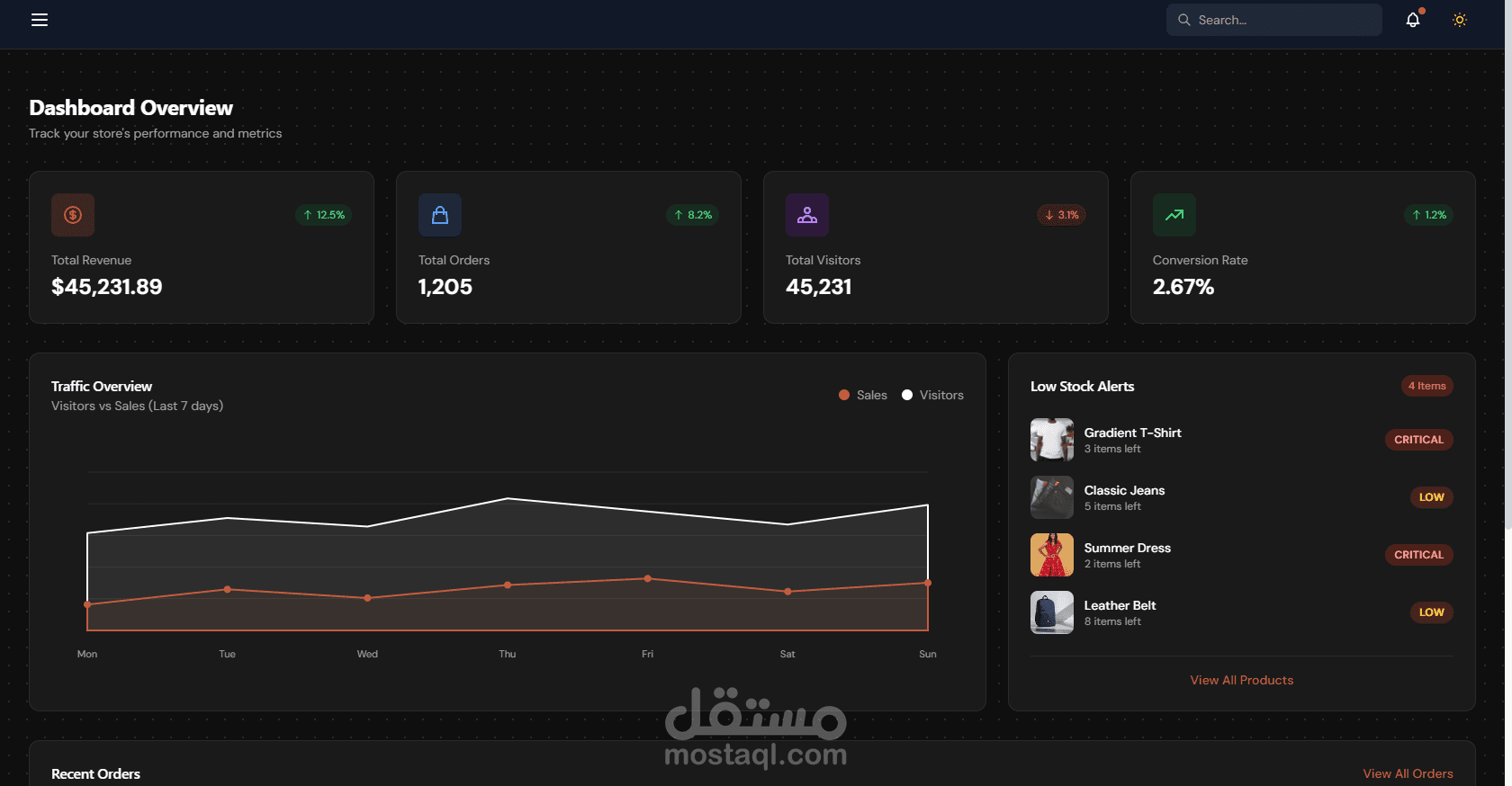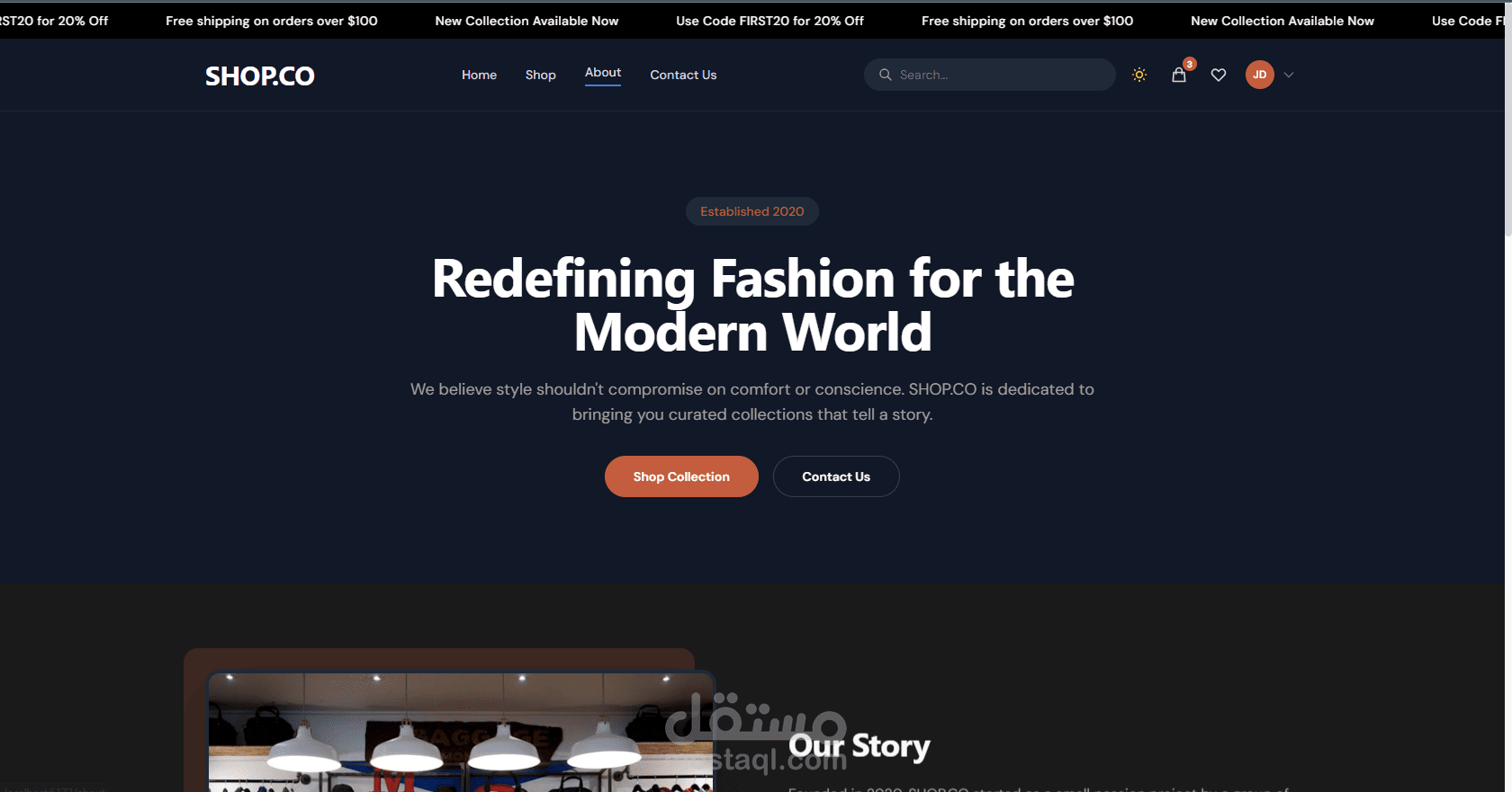 This project is a complete ecommerce web application designed to simulate a real online store experience. The application includes both a customer interface and an admin management system, allowing full control over the store’s operations. The frontend was developed using React with Vite to ensure fast performance and a modern development environment. The user interface is responsive and optimized for different screen sizes, providing a smooth shopping experience across devices. The application also supports Light and Dark mode themes, which improves usability and user preference. The admin dashboard allows administrators to manage products, users, and store data through a clean and organized interface. It includes components such as a sidebar navigation menu, topbar controls, and responsive layouts designed for efficient store management. On the backend, the application is powered by Node.js and Express.js, following the MVC architecture pattern to maintain clean and scalable code structure. The backend provides RESTful APIs that handle authentication, data processing, and CRUD operations for products and users. The database layer uses MongoDB, which stores all application data such as user accounts, product listings, and store information. Communication between the frontend and backend is handled using Axios, allowing secure and efficient data exchange through APIs. This project demonstrates strong full-stack development skills including frontend UI development, backend API architecture, database integration, responsive design, and modern theme management.