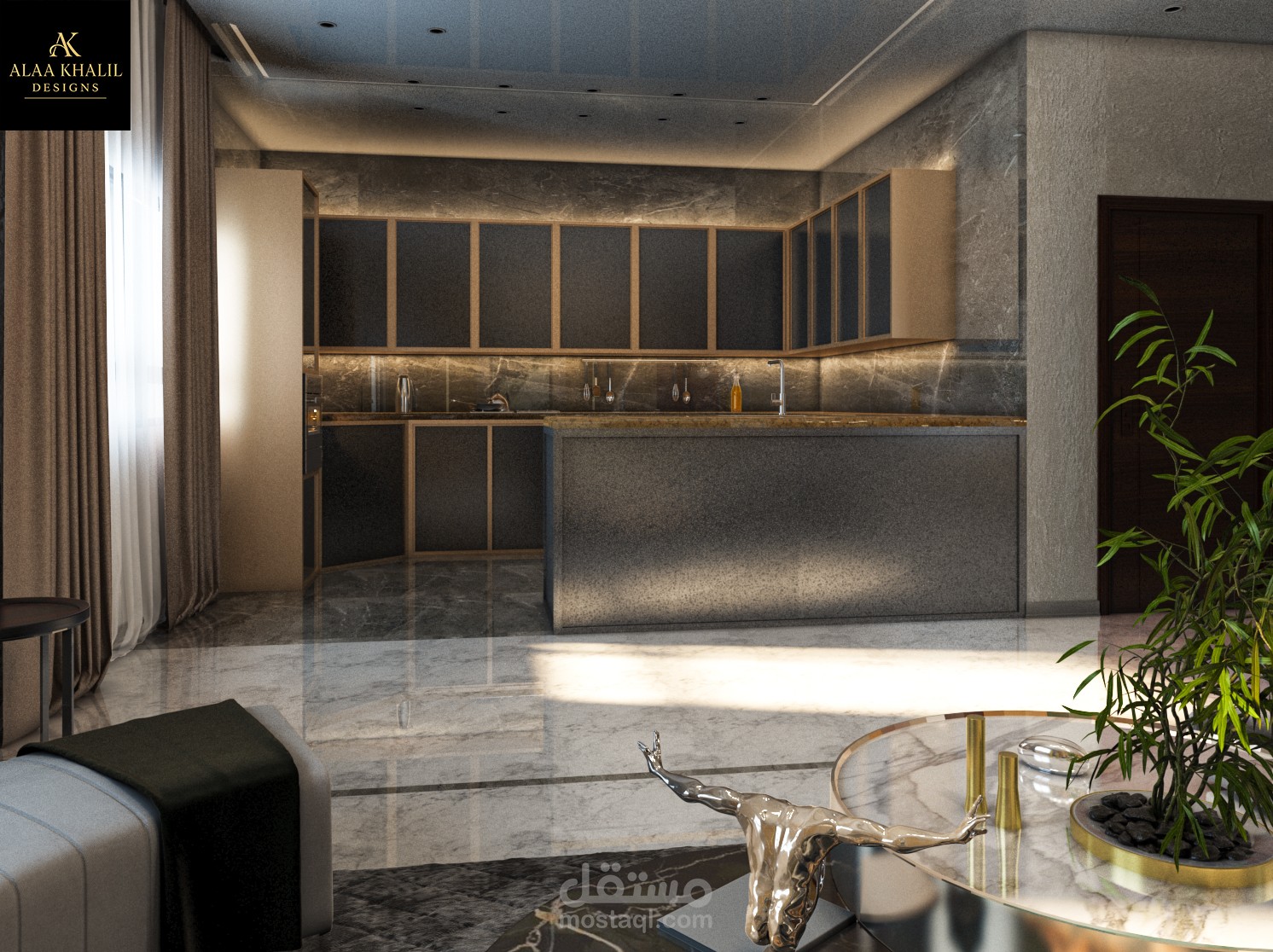 هذا المشروع من تصميم Alaa Khalil Designs (أو Alaa Khalil Designs Interior | Exterior | Landscape)، وهو يُمثل غرفة معيشة فاخرة وعصرية بأسلوب معاصر فاخر (Contemporary Luxury) مع لمسات نيو كلاسيك خفيفة وتأثيرات Art Deco حديثة.