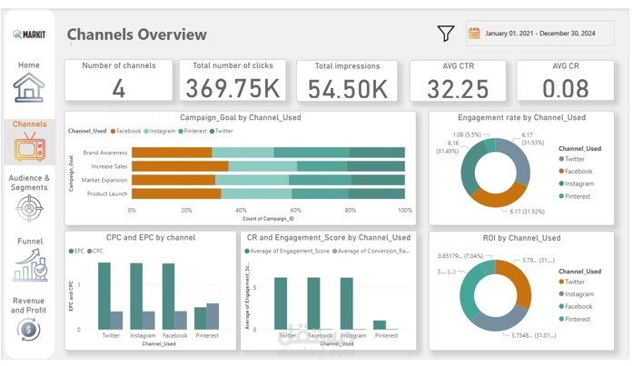 Channels Overview: Focuses on the performance of different marketing channels, analyzing their contribution to clicks, impressions, and overall engagement.
