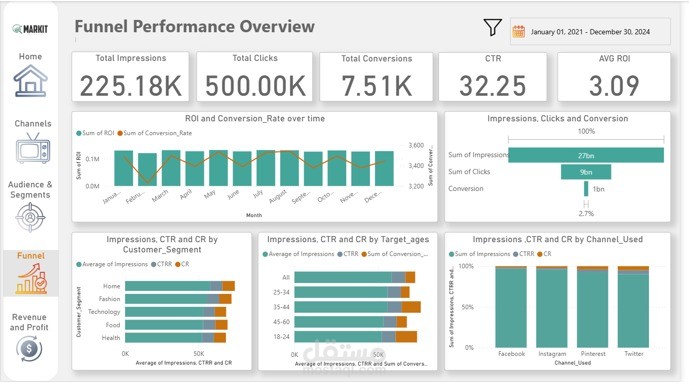 Funnel Performance Overview: Tracks the customer journey from impressions to conversions, identifying potential bottlenecks and areas for optimization within the marketing funnel.