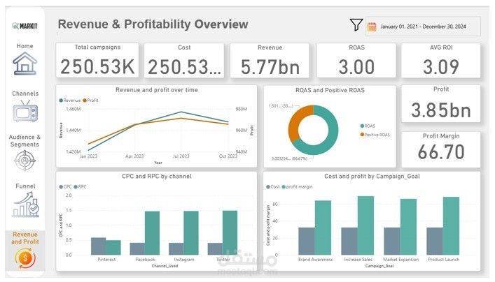 Revenue & Profitability Overview: Presents a financial perspective of the campaigns, detailing costs, revenue, profit, and return on ad spend (ROAS).