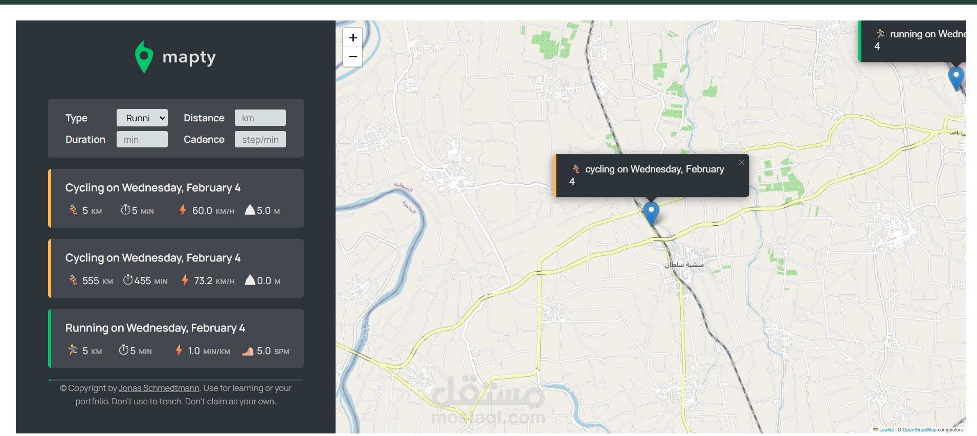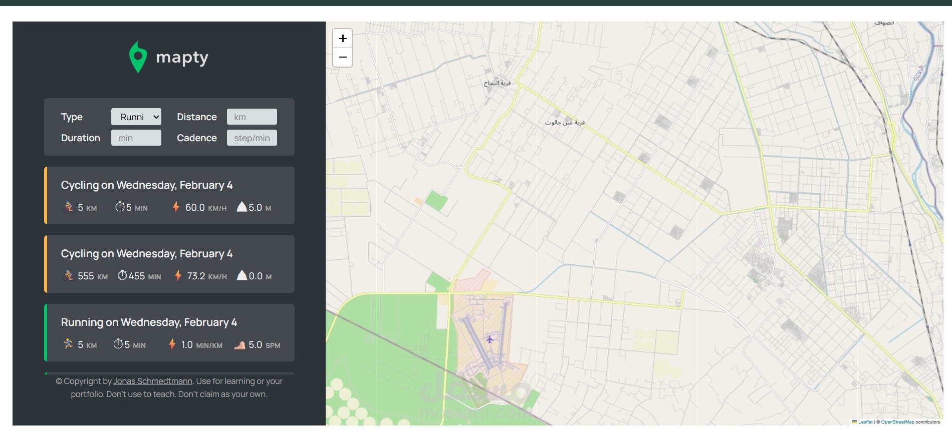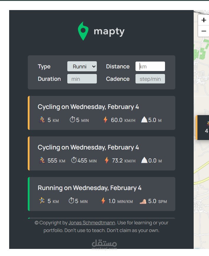 Mapty App هو تطبيق ويب تفاعلي يسمح للمستخدم بتتبع وتسجيل الأنشطة الرياضية مثل الجري وركوب الدراجات على الخريطة باستخدام تحديد الموقع الجغرافي.