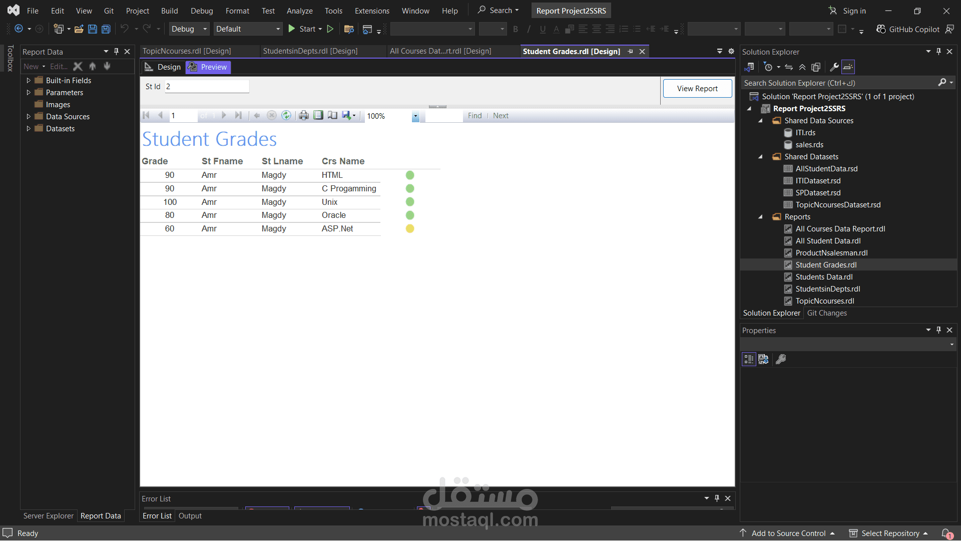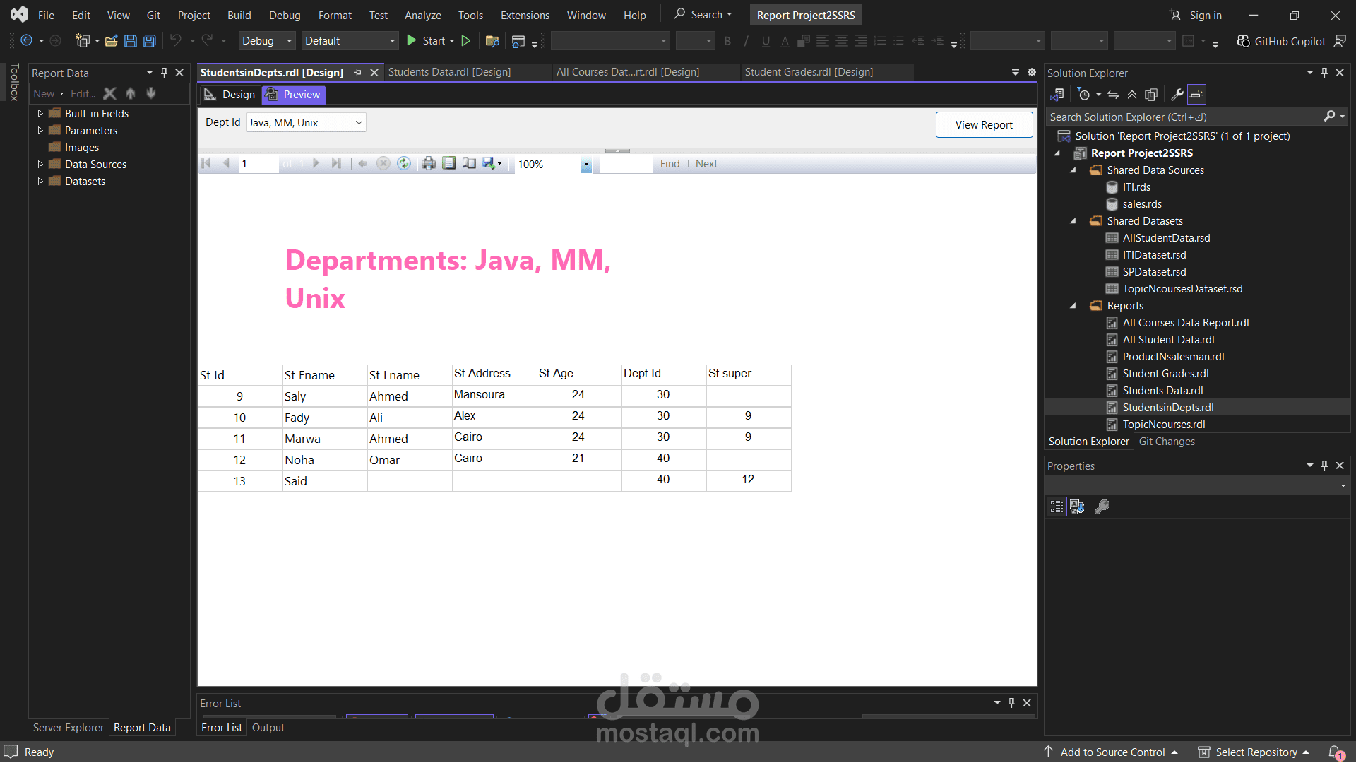 تطوير تقارير بيانات ديناميكية باستخدام SSRS داخل Visual Studio مرتبطة بقاعدة بيانات SQL Server لعرض وتحليل البيانات بشكل منظم.