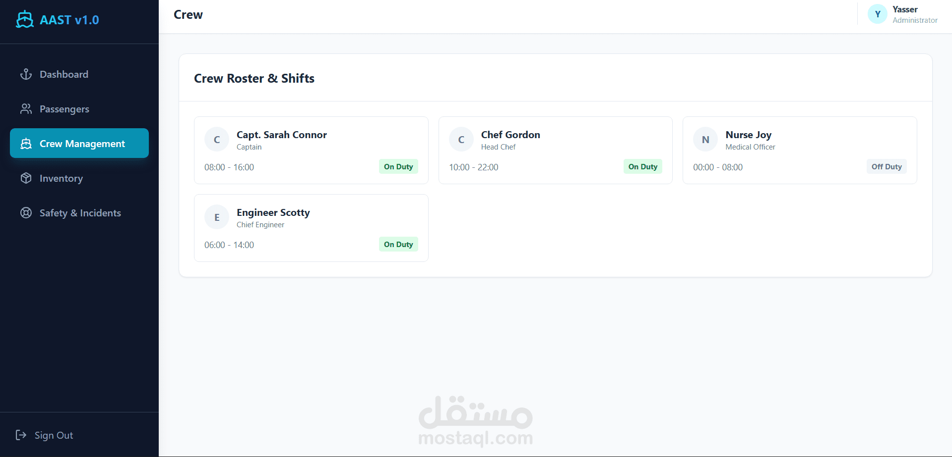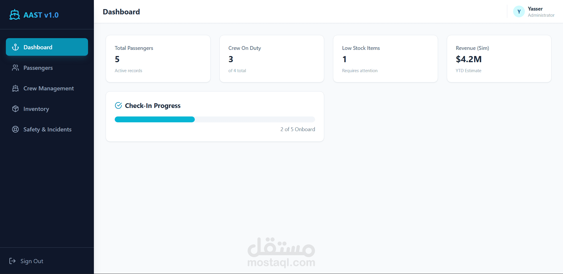 نظام إداري متكامل (Dashboard) مصمم لتنظيم العمليات اليومية على متن السفن السياحية بكفاءة عالية. يتميز النظام بواجهة مستخدم عصرية وسهلة الاستخدام، تتيح للمسؤولين التحكم في كافة جوانب الرحلة من مكان واحد.