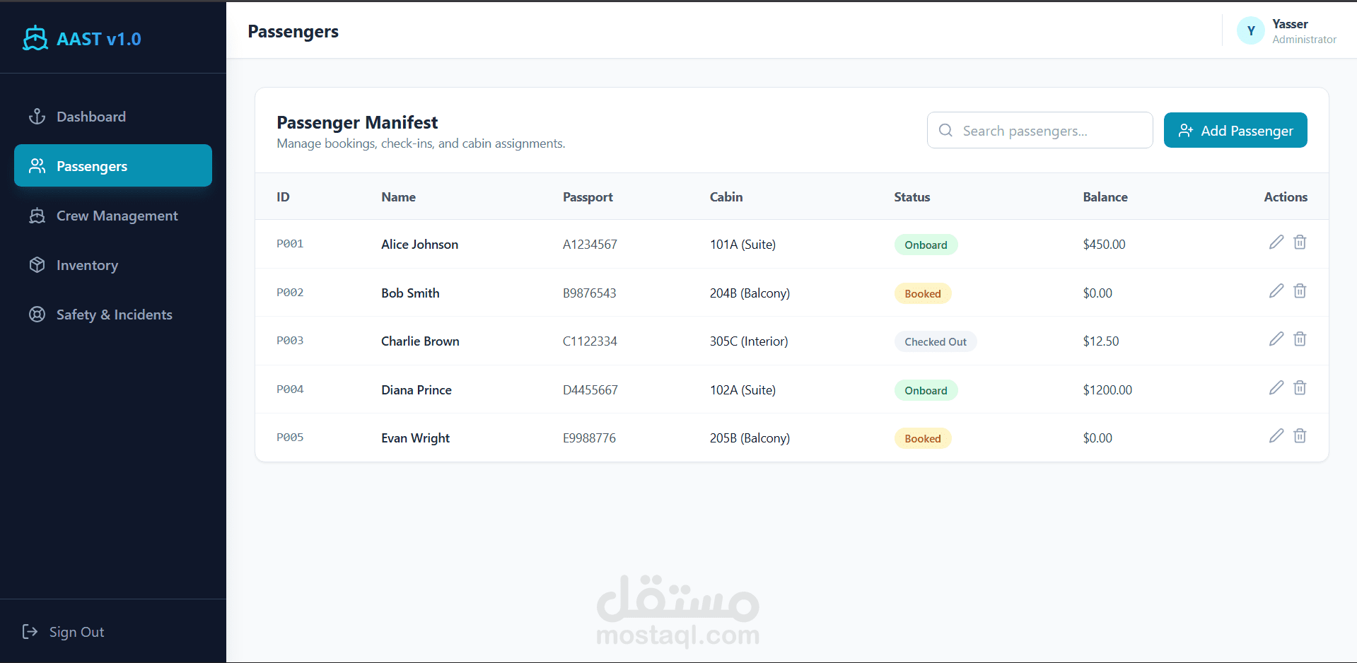 إدارة الركاب (Passenger Manifest): قاعدة بيانات شاملة للركاب تشمل أرقام الجوازات، توزيع الكبائن، تتبع الحالات (Onboard/Booked)، وإدارة المديونيات.
