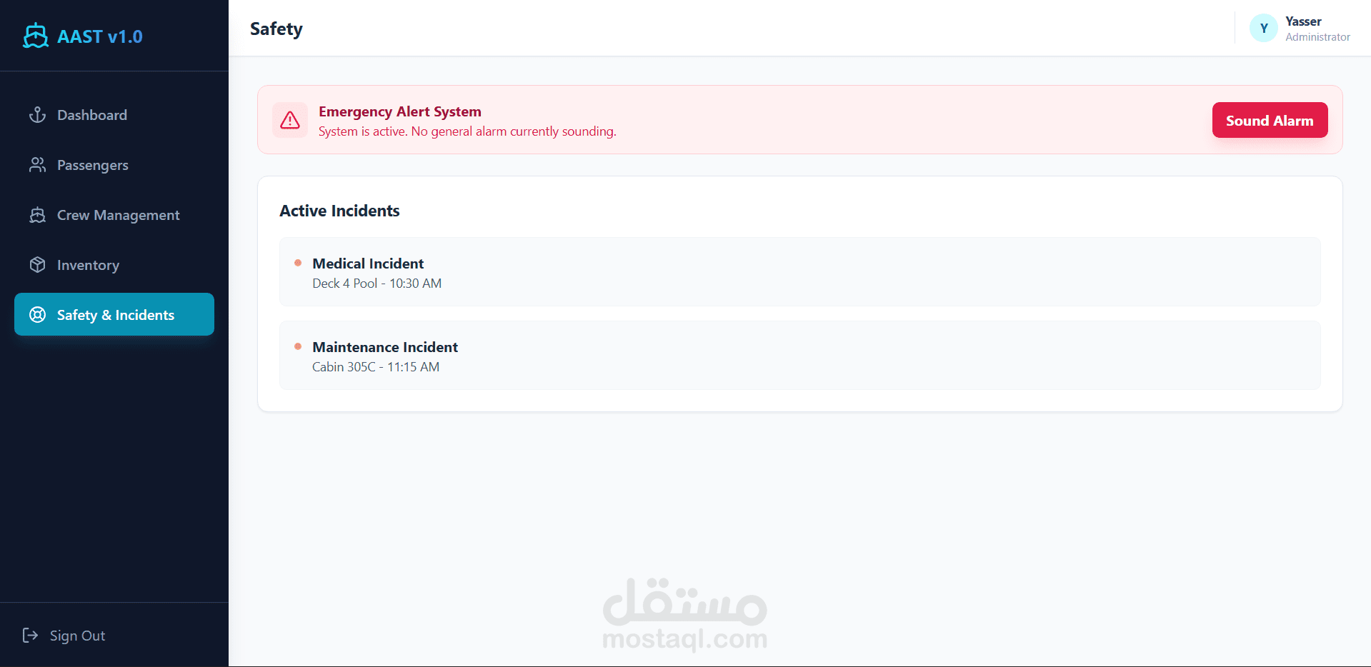 نظام السلامة والطوارئ (Safety & Incidents): إدارة فورية للحوادث (طبية، تقنية) مع ميزة "إنذار الطوارئ" لضمان أمن وسلامة الجميع.
