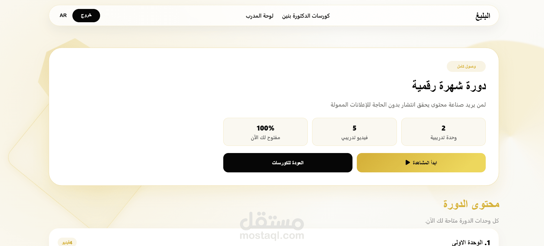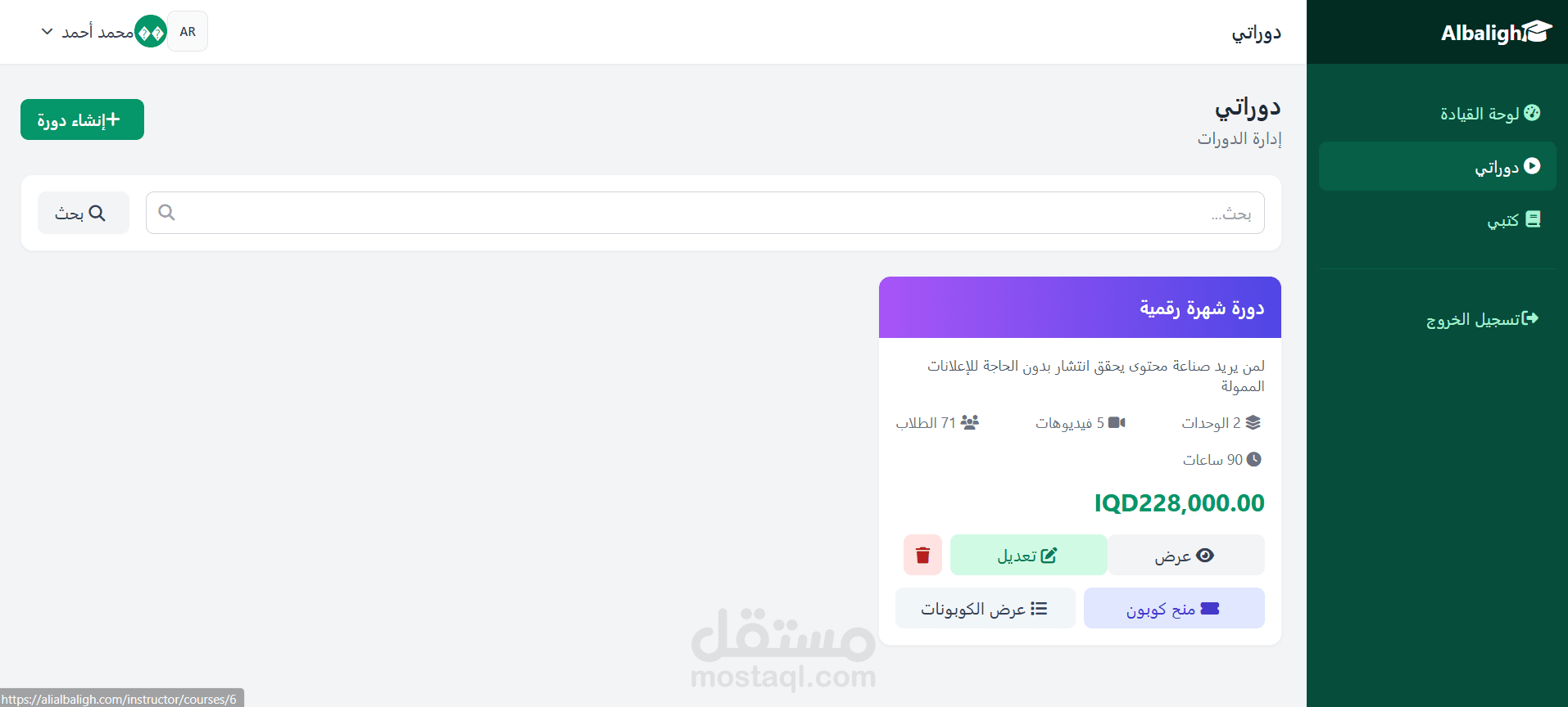 مشروع Albaligh، وهي منصة تعليمية رقمية متكاملة لإدارة وبيع الدورات والكتب الإلكترونية. يشمل المشروع واجهة عرض للمستخدمين لاستعراض الدورات ومحتواها، مع نظام صلاحيات متعدد الأدوار يضم الإدارة والمدربين والمستخدمين. طورت لوحات تحكم خاصة بالمدربين لإضافة الدورات، تنظيم الوحدات والدروس المرئية، رفع ملفات الوسائط، إدارة الكتب الرقمية، وتحديد الأسعار والخصومات. كما يتضمن المشروع نظام شراء ودفع إلكتروني، إدارة وصول المستخدمين إلى المحتوى بعد الدفع، كوبونات مخصصة للدورات، ودعمًا للغتين العربية والإنجليزية. تم تنفيذ المشروع باستخدام Laravel مع بنية منظمة تركز على الأداء، سهولة الإدارة، وتجربة استخدام واضحة.