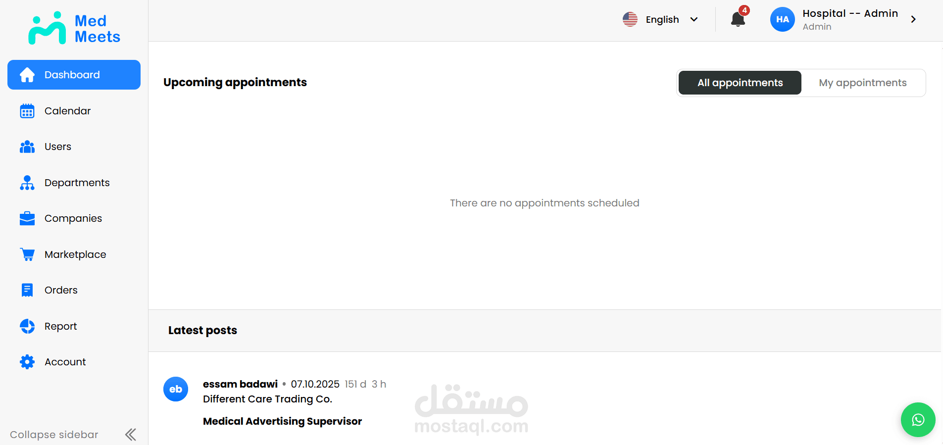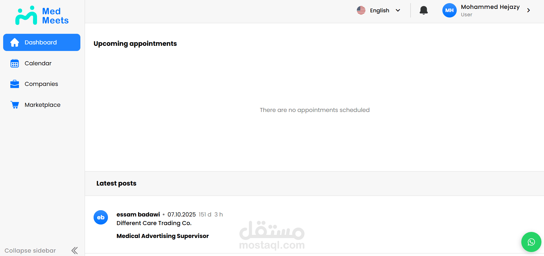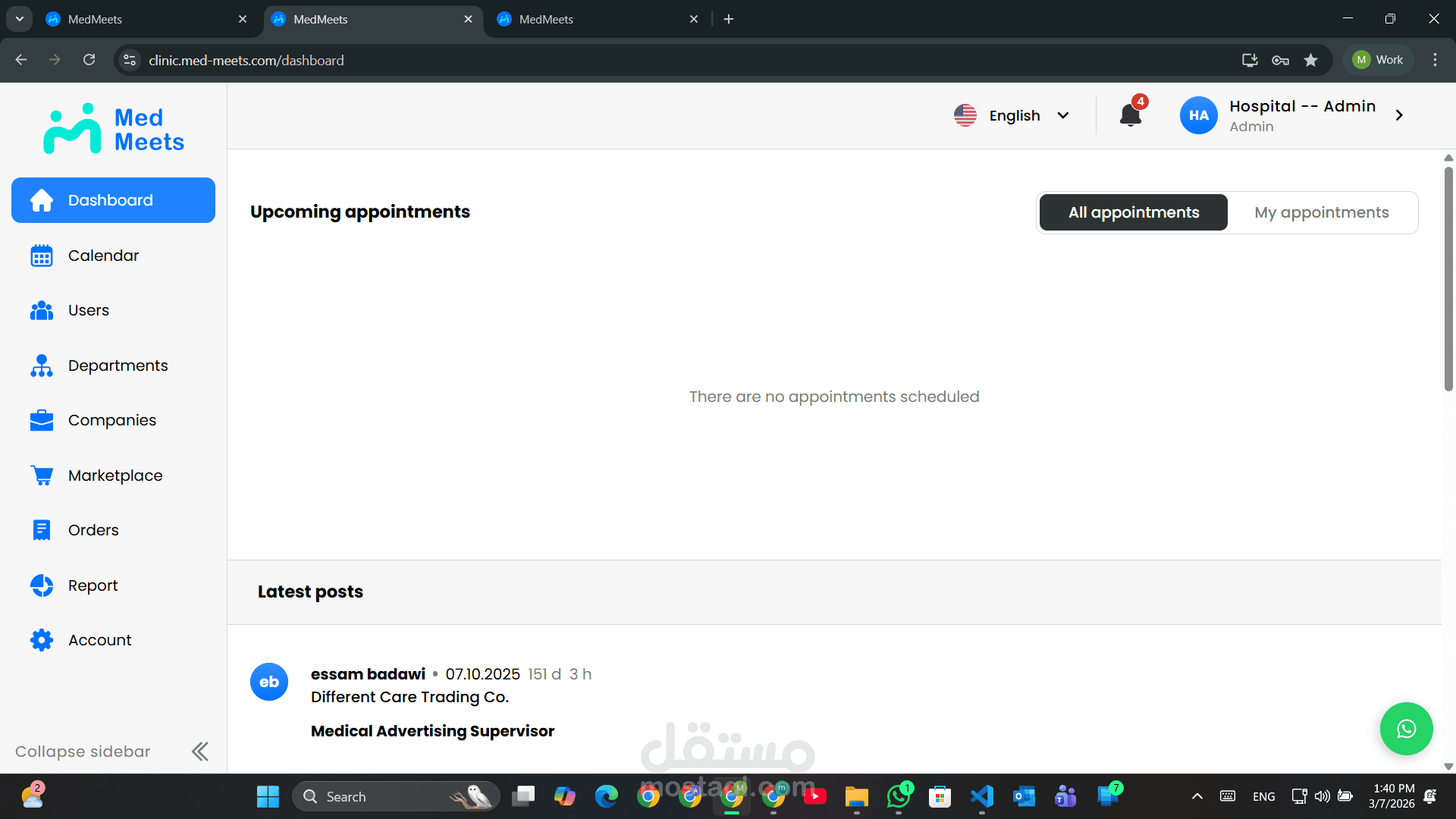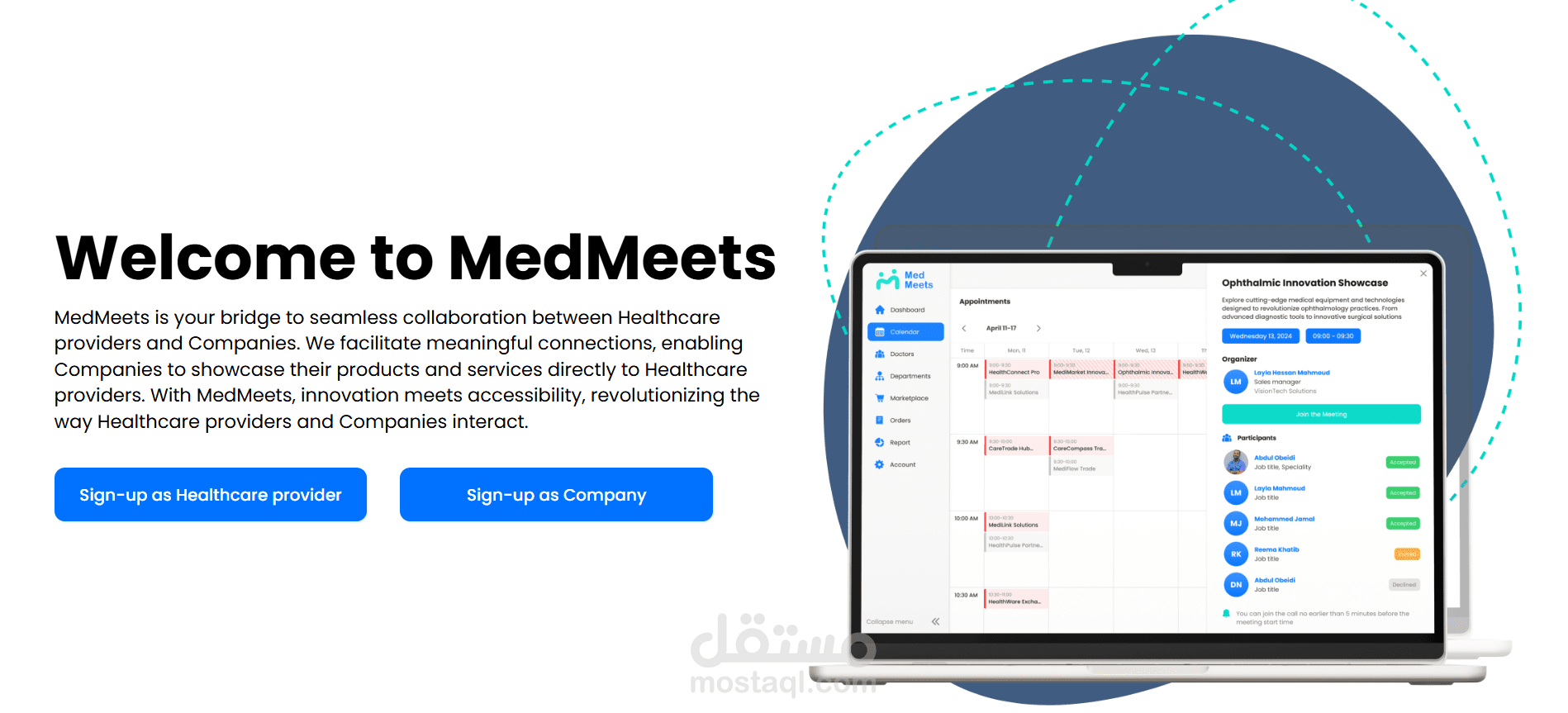 مشروع Med Meets، وهو منصة رقمية تهدف إلى تنظيم وإدارة اللقاءات الطبية وربط الأطباء والمتخصصين والجهات الصحية ضمن تجربة استخدام واضحة وسهلة. يتيح المشروع إدارة المستخدمين، جدولة اللقاءات، متابعة المشاركين، وتنظيم المعلومات والبيانات المرتبطة بكل اجتماع أو فعالية طبية من خلال لوحة تحكم عملية وواجهة استخدام متجاوبة. ركزت في تنفيذ المشروع على سهولة الوصول للمعلومات، تحسين تجربة المستخدم، وبناء نظام موثوق يدعم سير العمل بشكل منظم واحترافي.