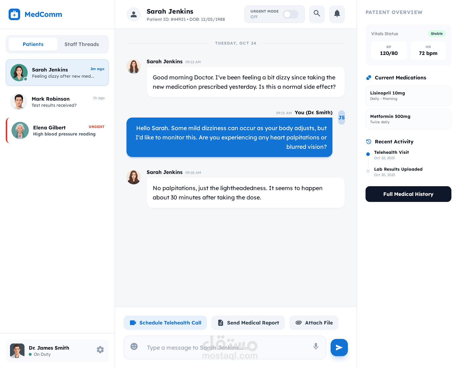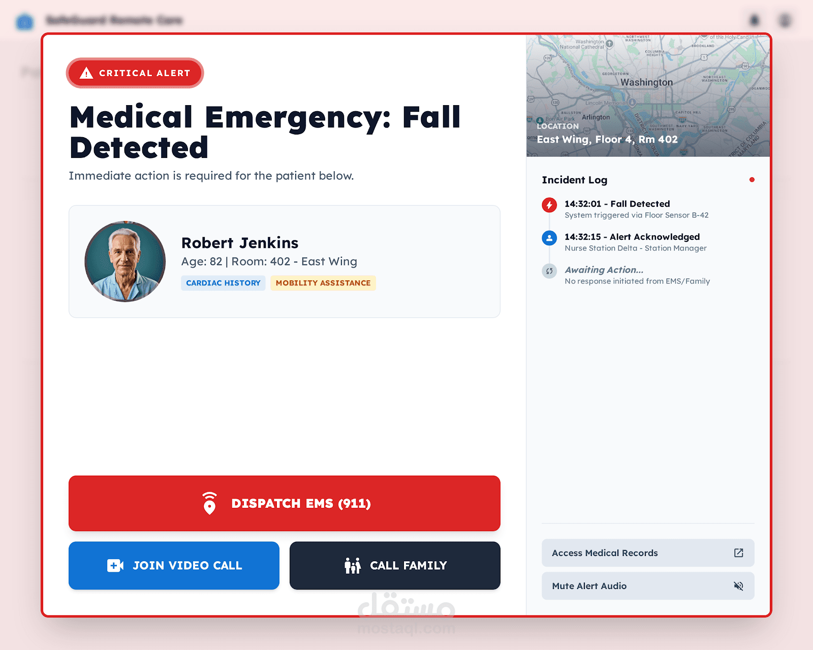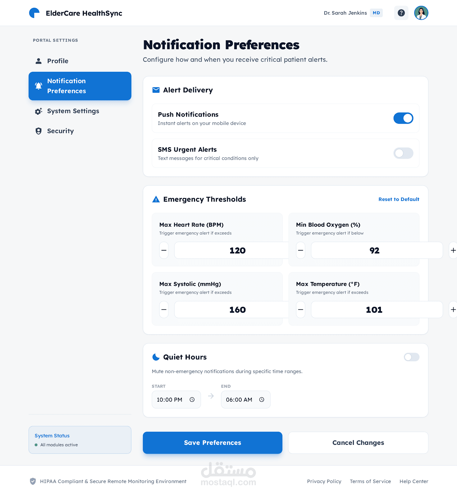 desktop portal used by doctors to monitor elderly patients remotely. Priority: 'Accessibility and Clarity.' Features include high-contrast vital sign charts, a large-button emergency alert, and a simplified patient history timeline. Style: Clean, medical-white background, large Sans-Serif fonts, and clear 'Success/Warning' color indicators