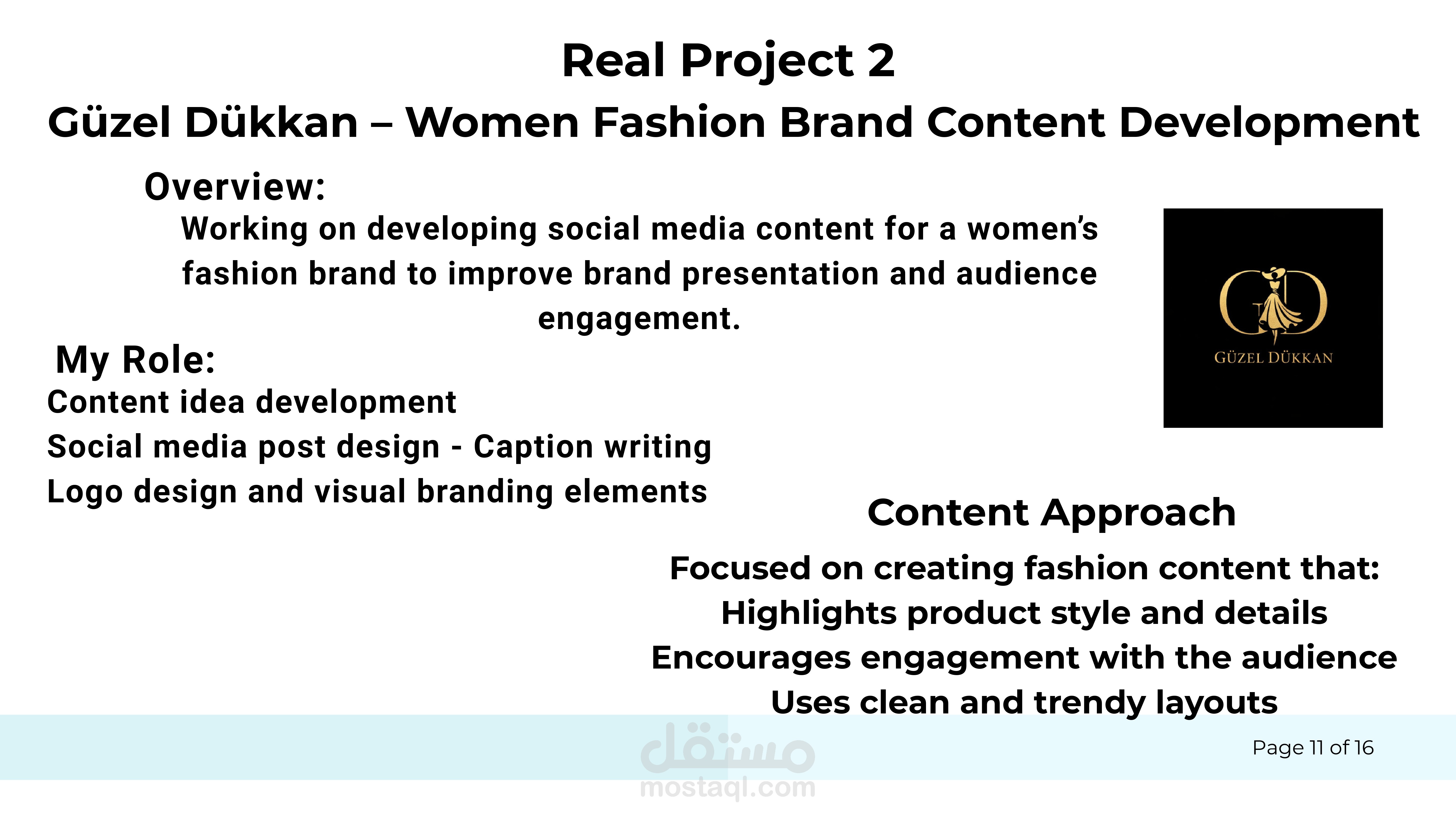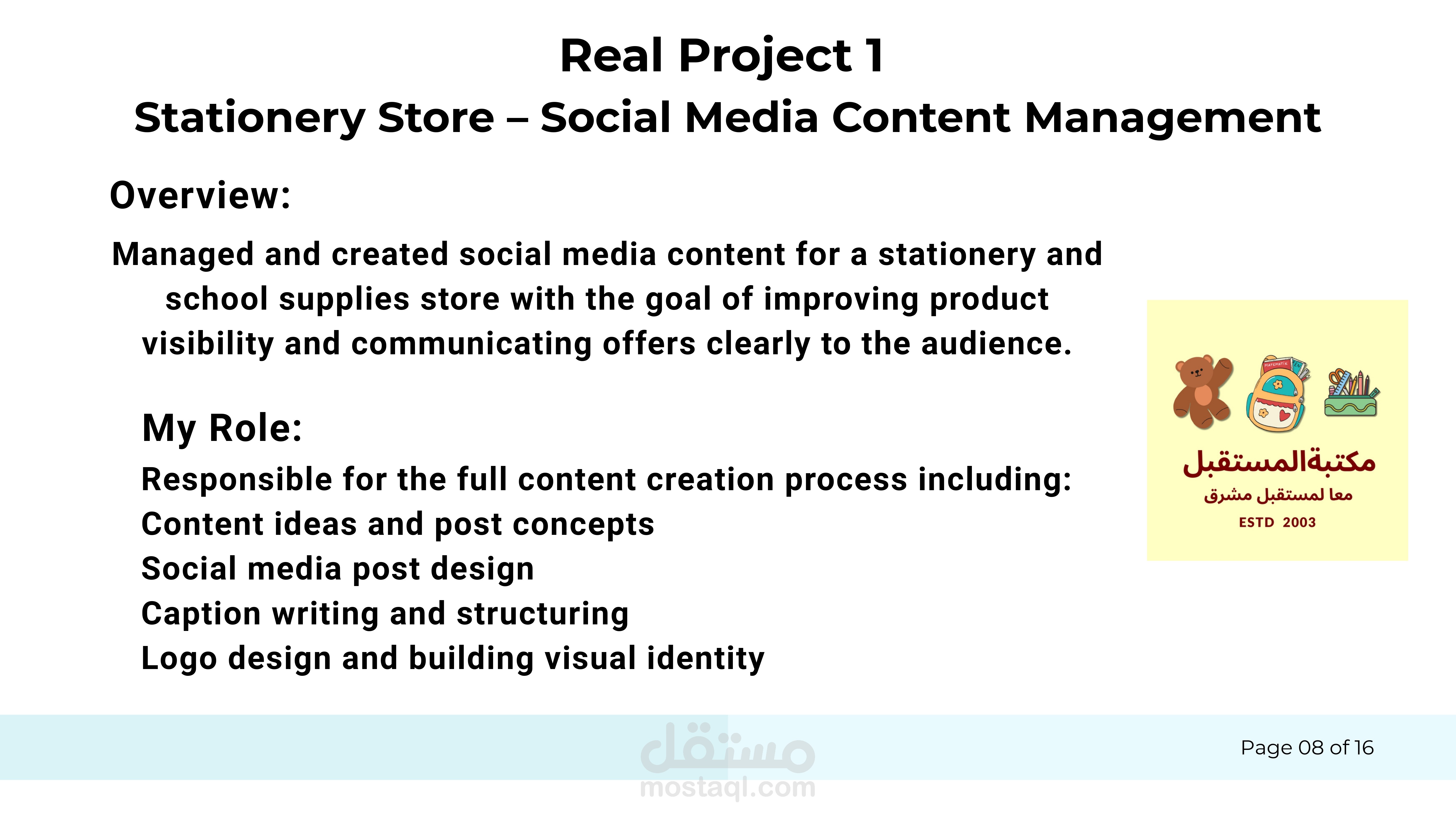 كما شمل المشروع المساهمة في تطوير الهوية البصرية للصفحات من خلال تنسيق أسلوب التصميم والمحتوى لضمان ظهور الصفحة بشكل احترافي ومتناسق. وتم أيضًا تصميم شعار بسيط للعلامة التجارية كجزء من بناء الهوية، مع التركيز الأساسي على استراتيجية المحتوى وإدارة الصفحة.