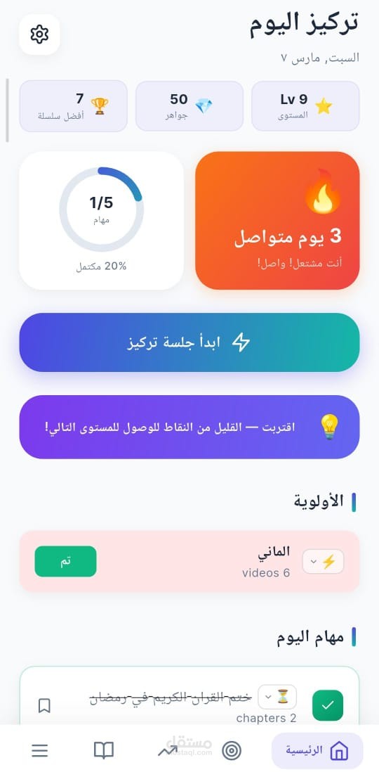 أولويات، تذكيرات، تقدم يومي، وتتبع الإنجاز.