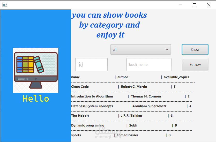 إدارة الكتب: يتيح النظام للمسؤولين إضافة كتب جديدة، وتحديث عدد النسخ المتاحة، أو البحث عن الكتب حسب الفئة (برمجة، قواعد بيانات، روايات).
