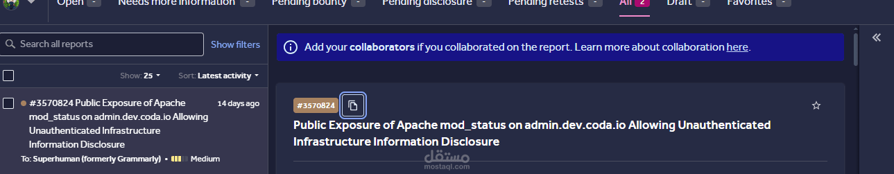 Reporting a vulnerability: Public Exposure of Apache mod_status on admin.dev.coda.io Allowing Unauthenticated Infrastructure Information Disclosure on the HackerOne website