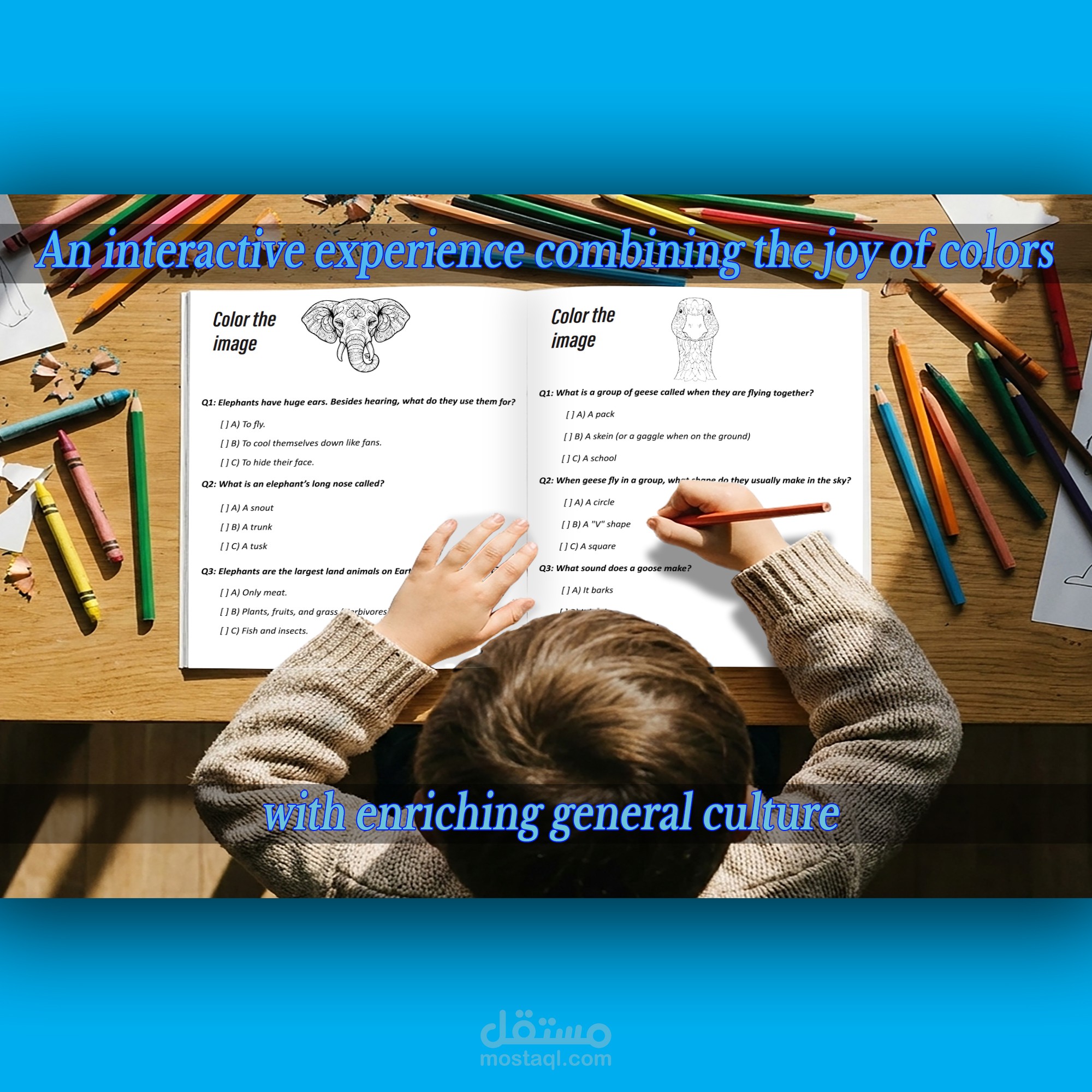 نشاط تلوين: يتضمن رسومات عالية الدقة (Line Art) للحيوانات مثل الذئاب، الفيلة، البجع، وغيرها، لتحفيز الإبداع وتنمية المهارات الحركية.