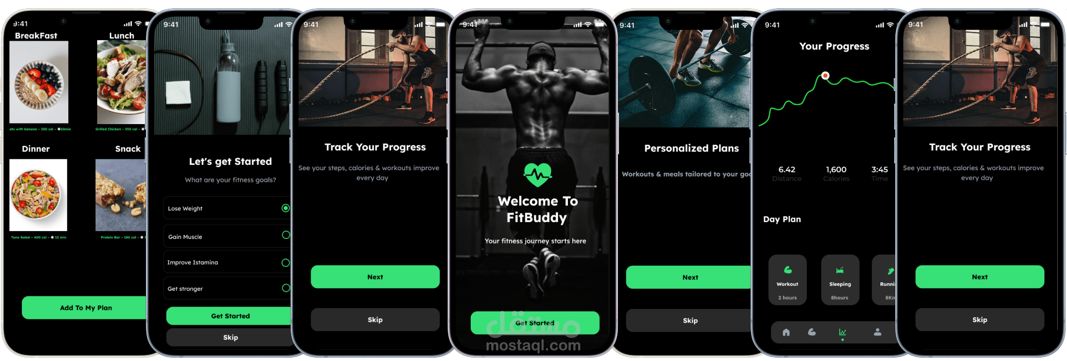تجربة المستخدم (UX Flow): صممت رحلة المستخدم لتبدأ بشاشات "Onboarding" ملهمة، تليها خطوة تحديد الأهداف (Lose Weight, Gain Muscle)، مما يخلق تجربة شخصية (Personalized Experience) من اللحظة الأولى.